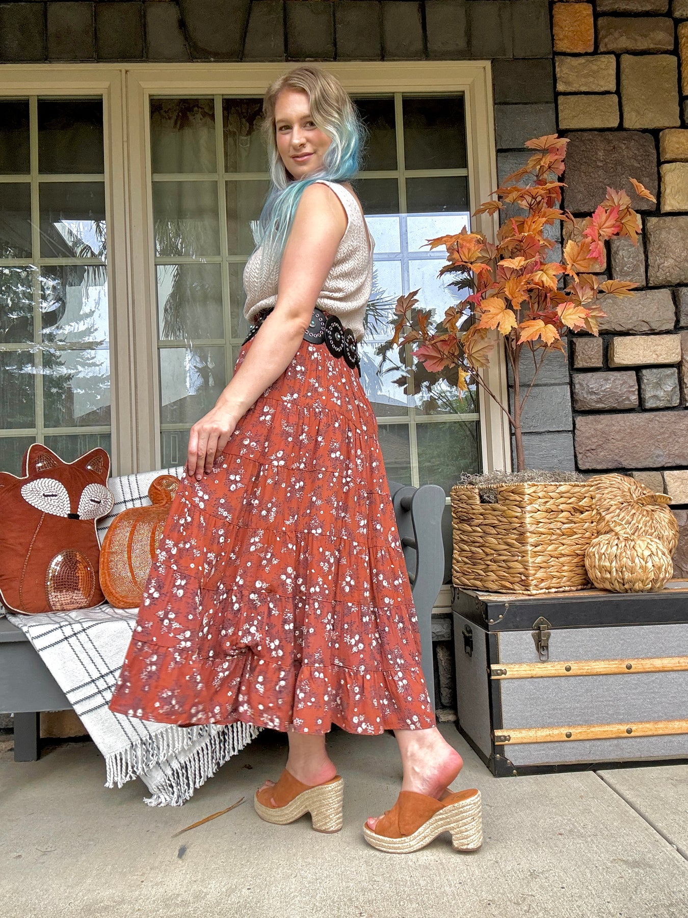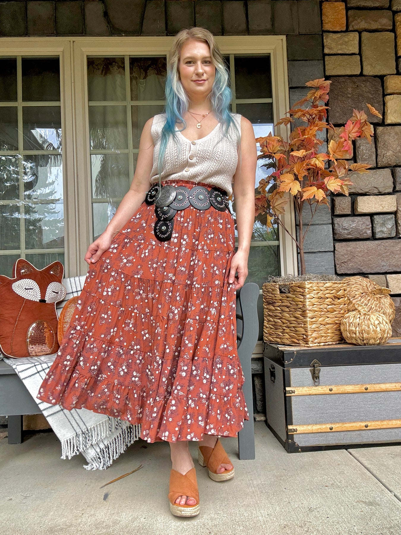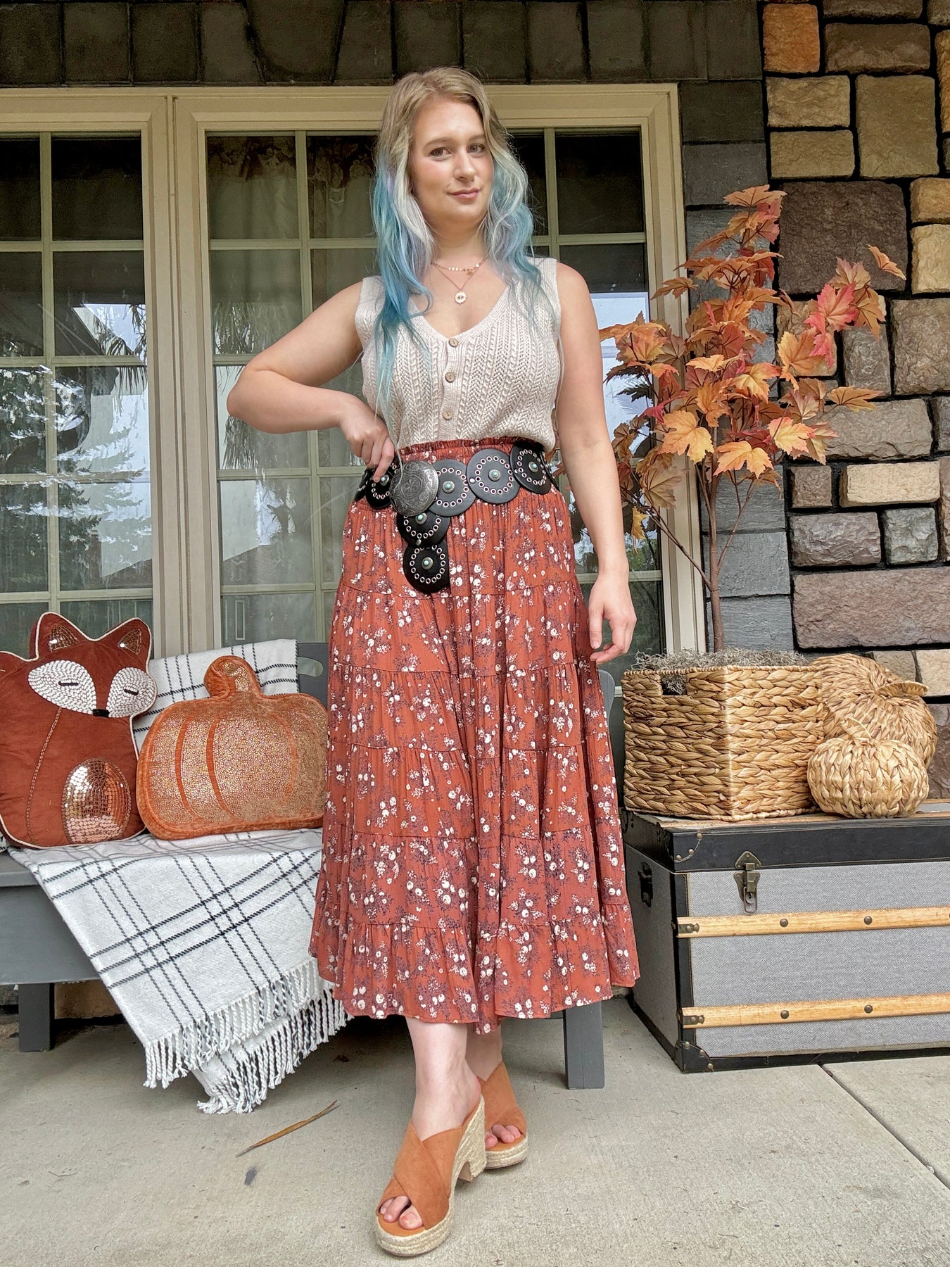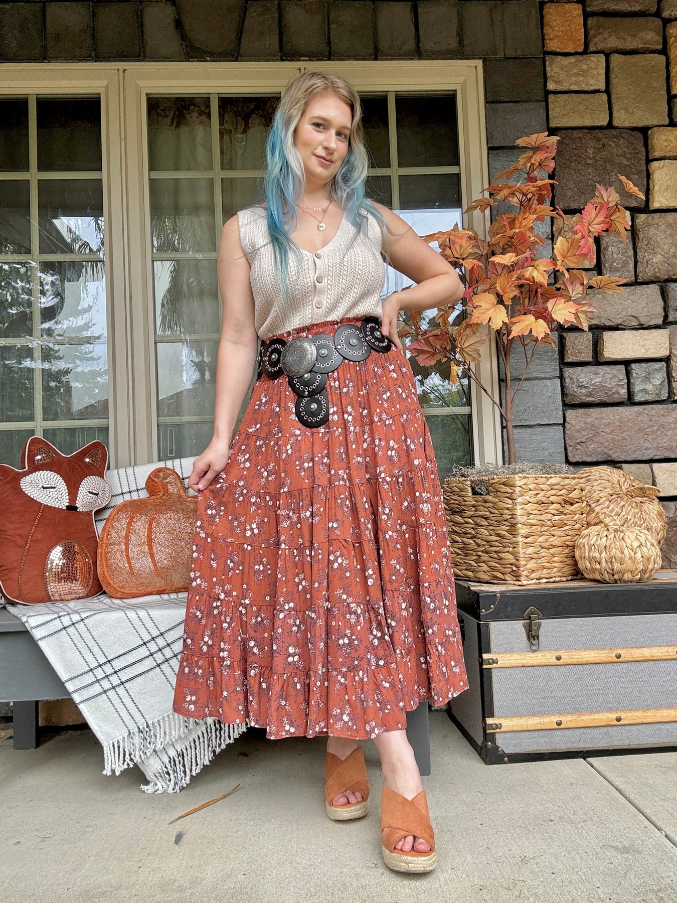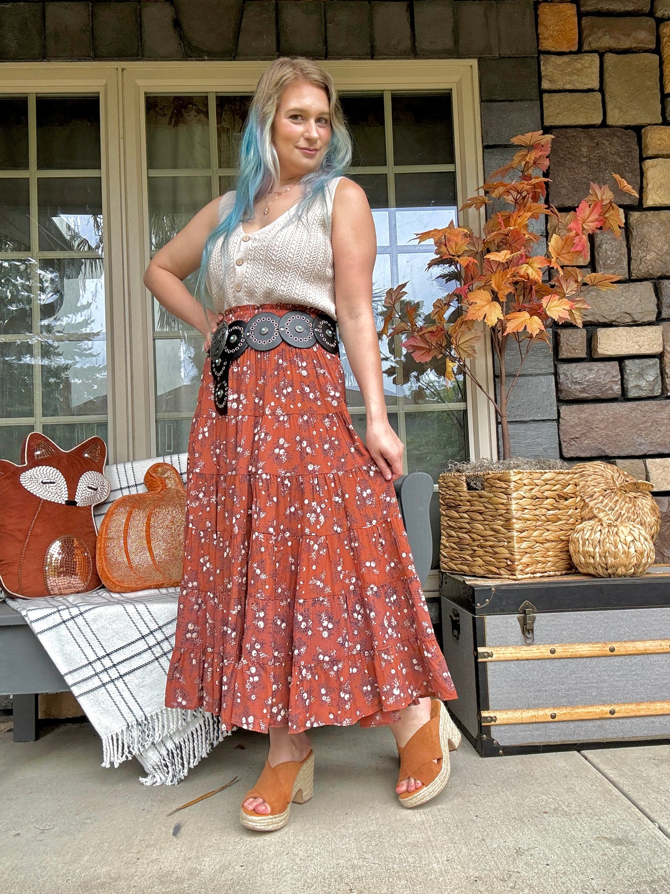 Boho floral tiered midi skirt that has an elastic waistband and lightweight flowy look!