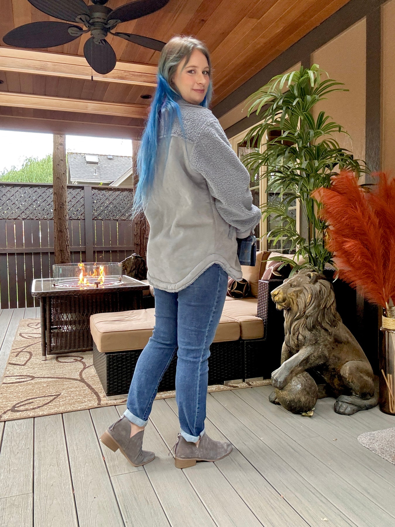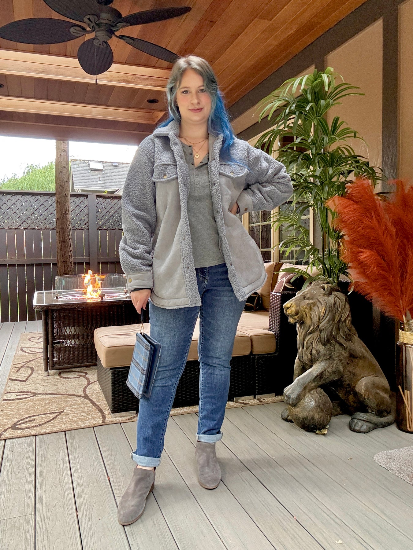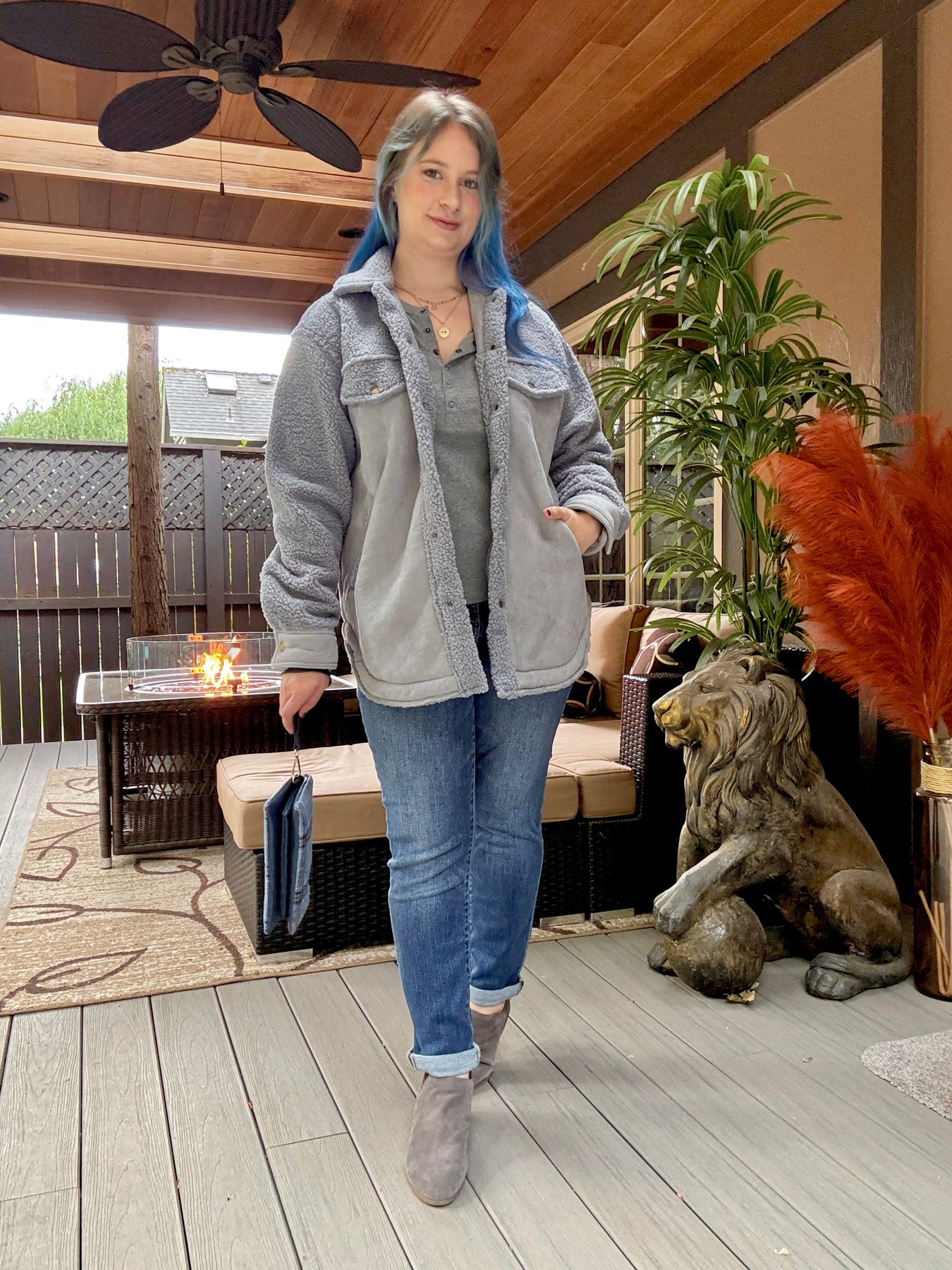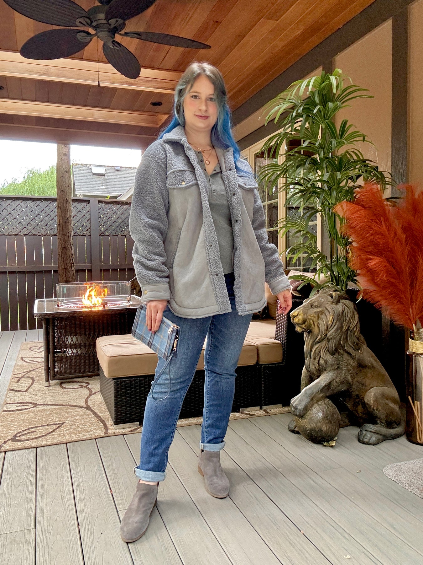Sherpa and faux suede contrast heavy jacket with snap button closure and front pockets.