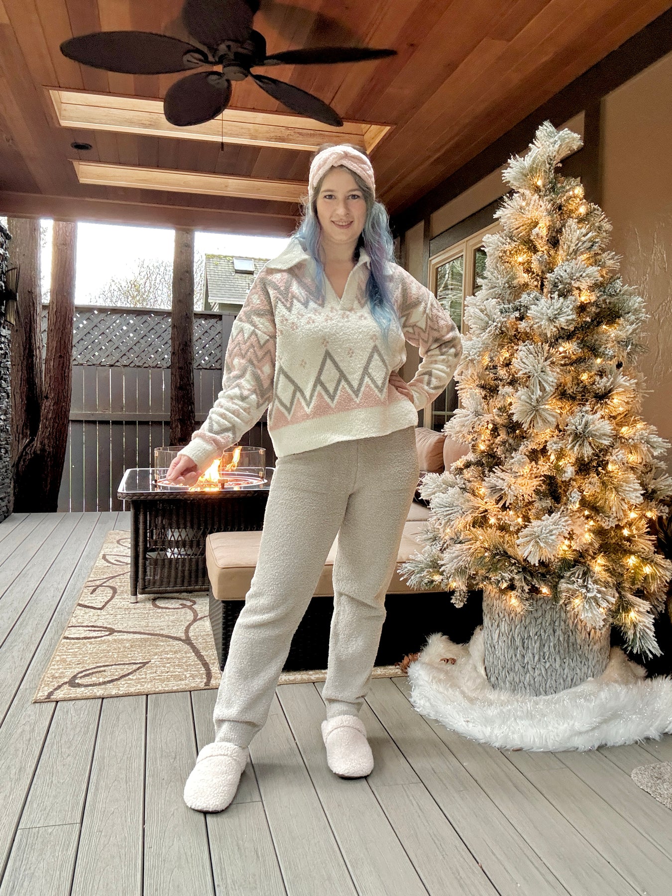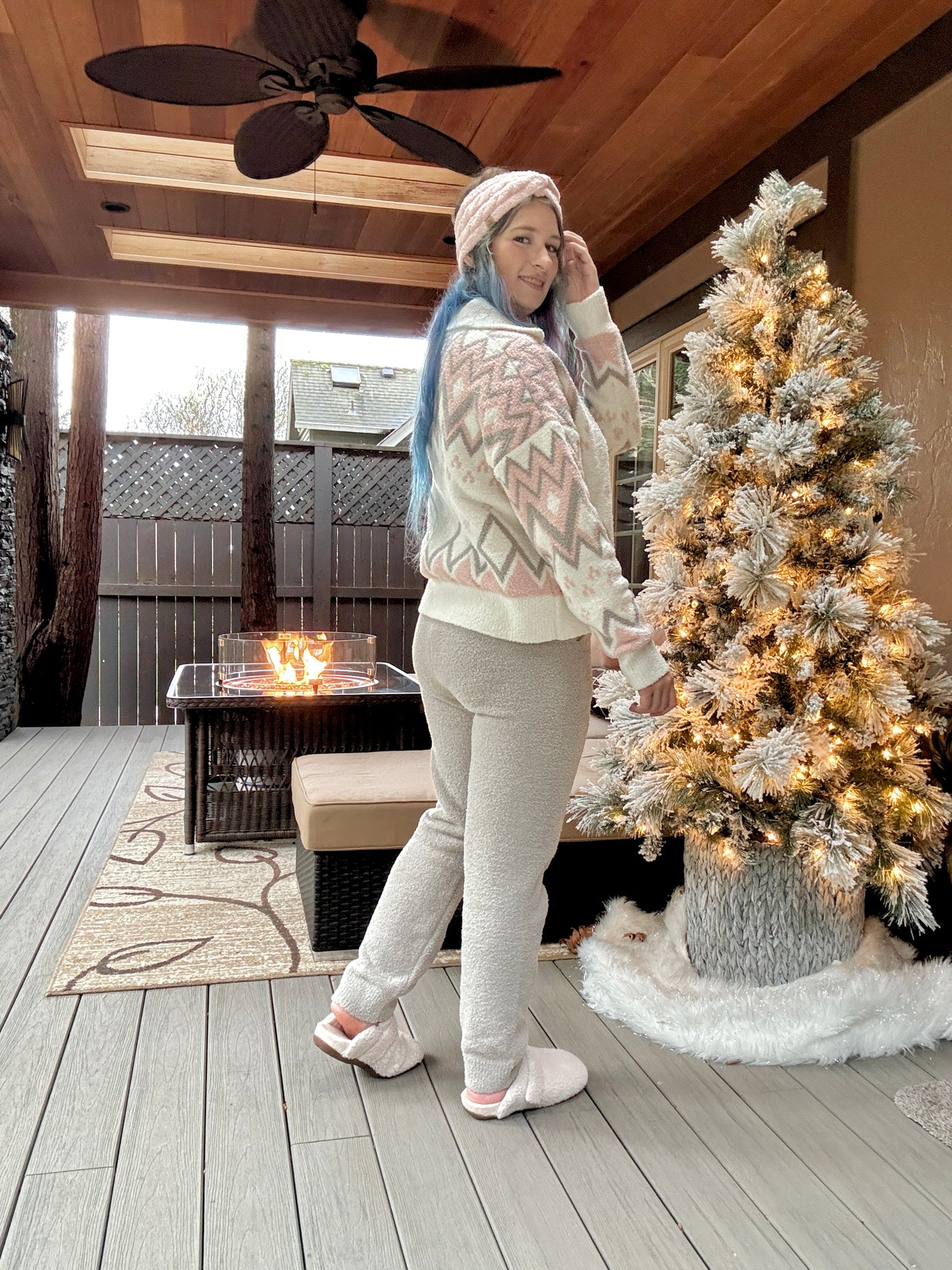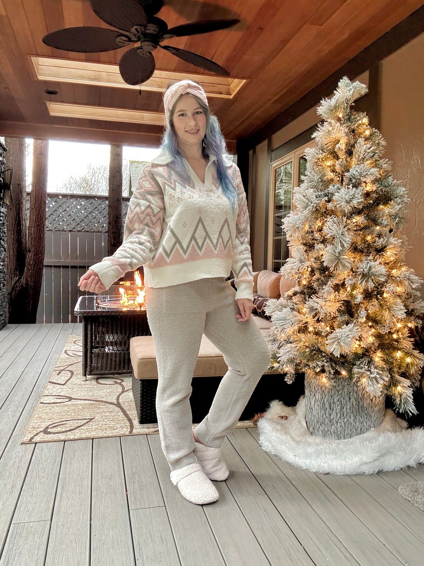 This ultra-soft collared sweater features a geometric pattern, making it perfect for lounging and casual outings.