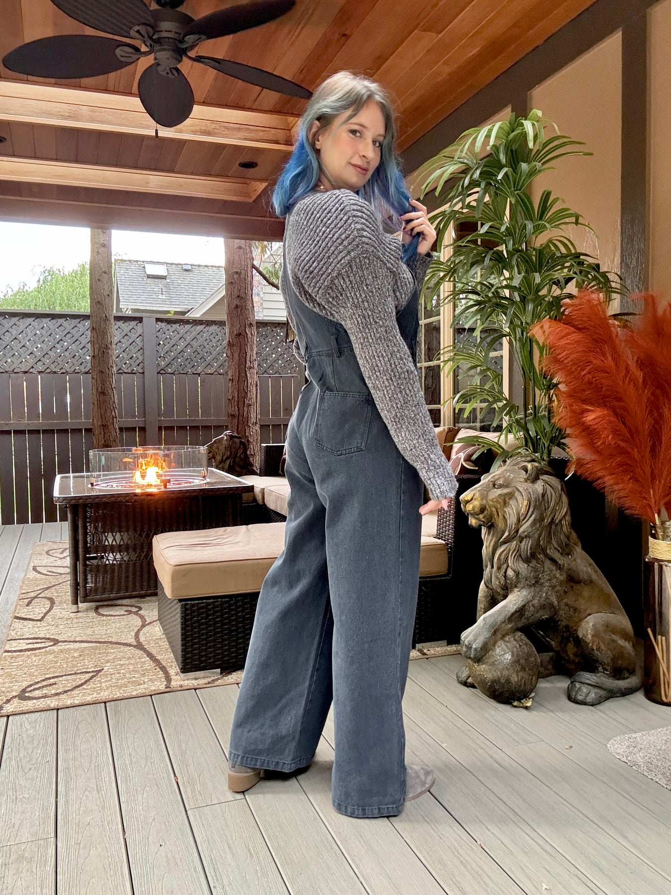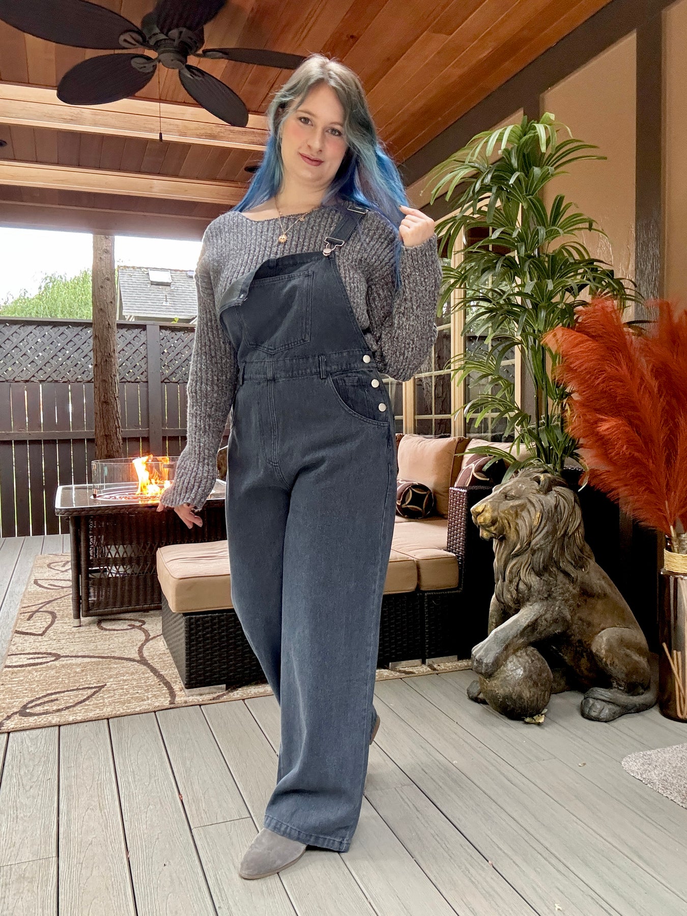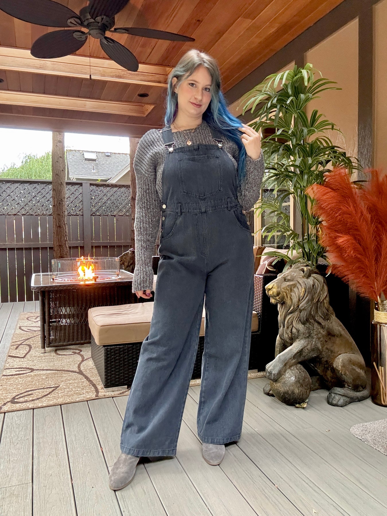 Denim straight leg overalls with side button closure and adjustable straps. Jumper also has front and back pockets.