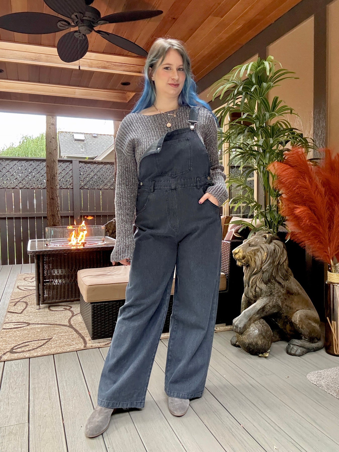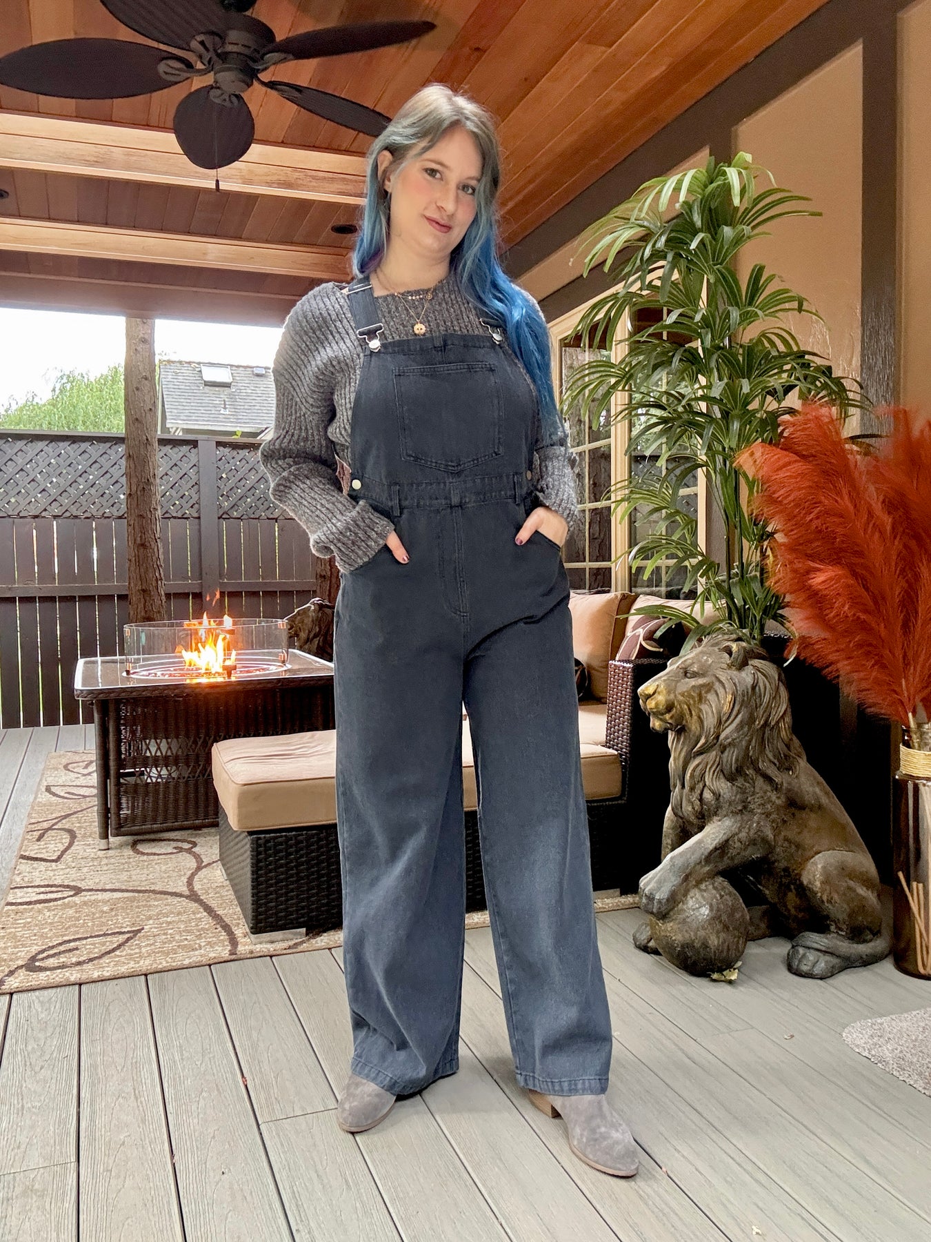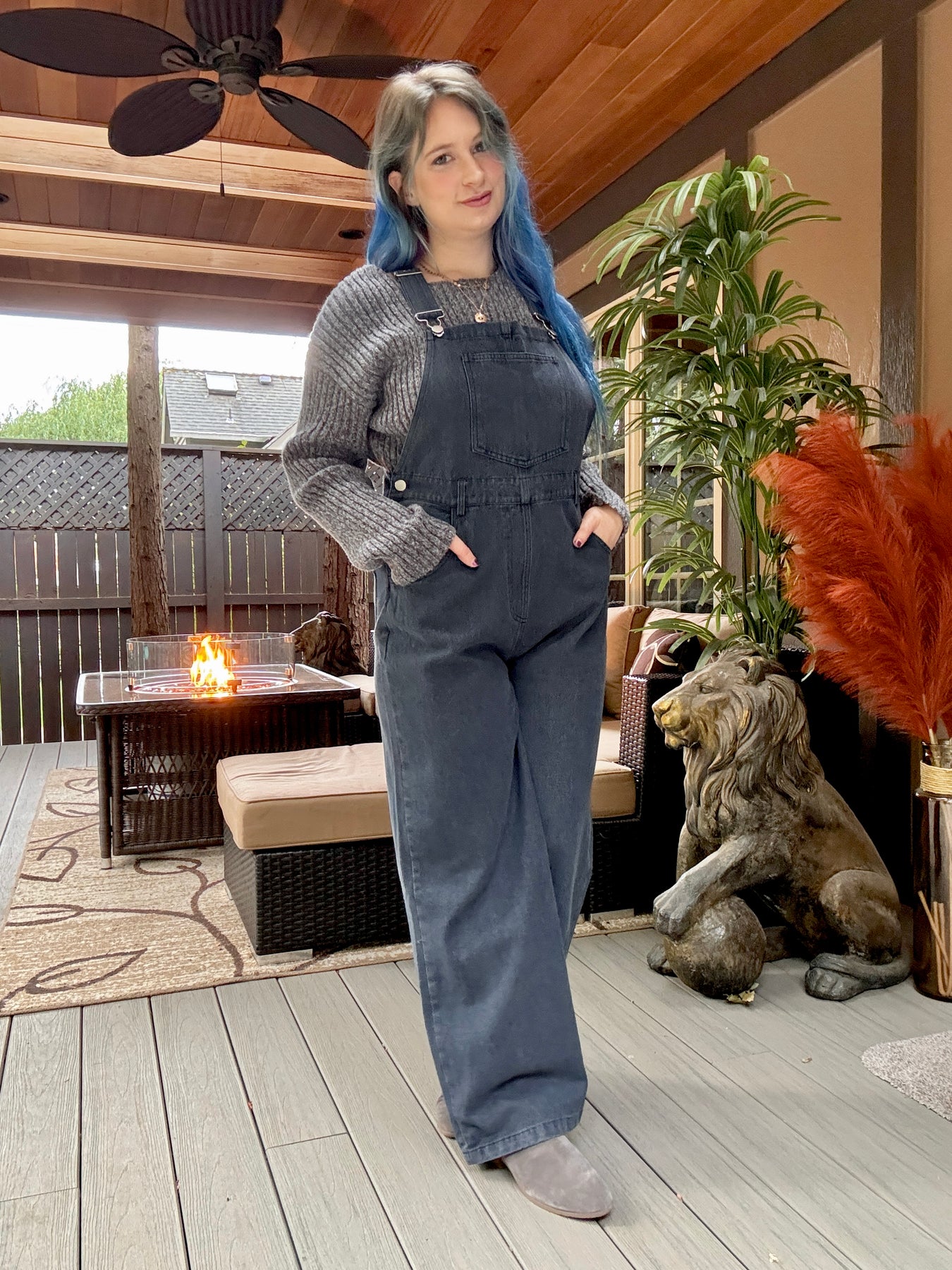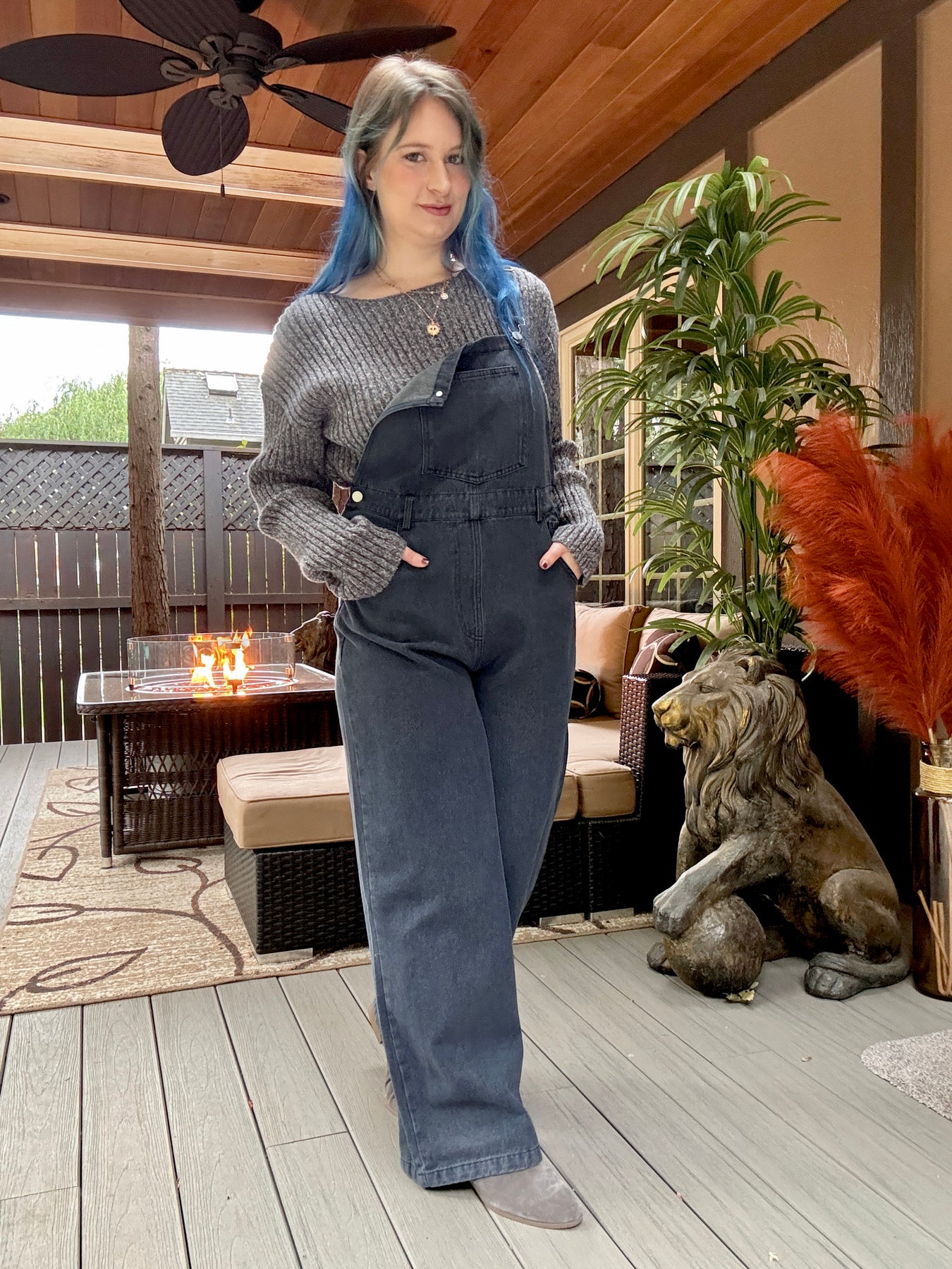 Denim straight leg overalls with side button closure and adjustable straps. Jumper also has front and back pockets.