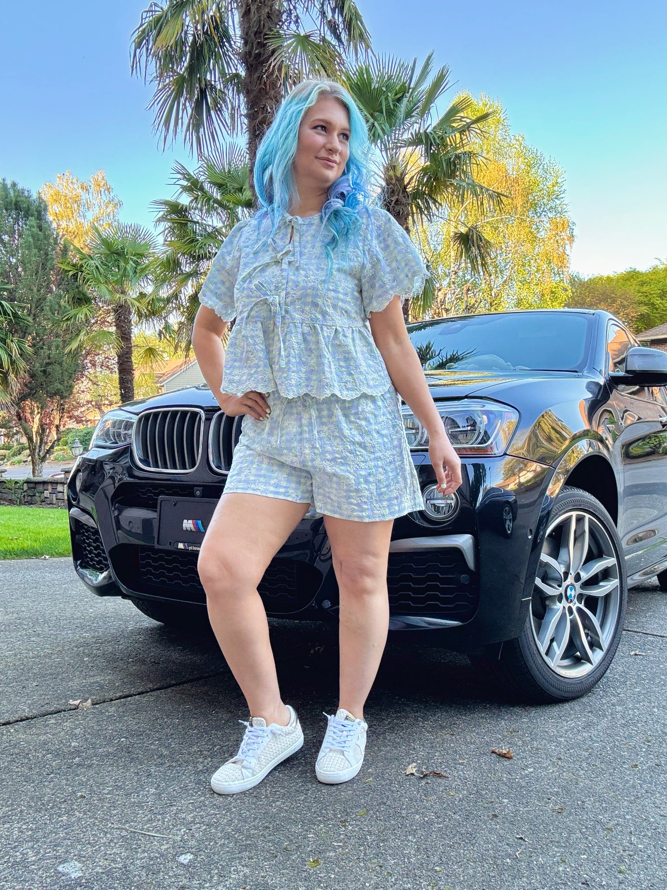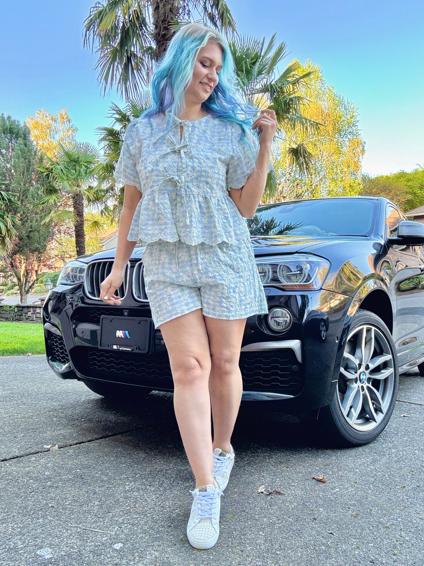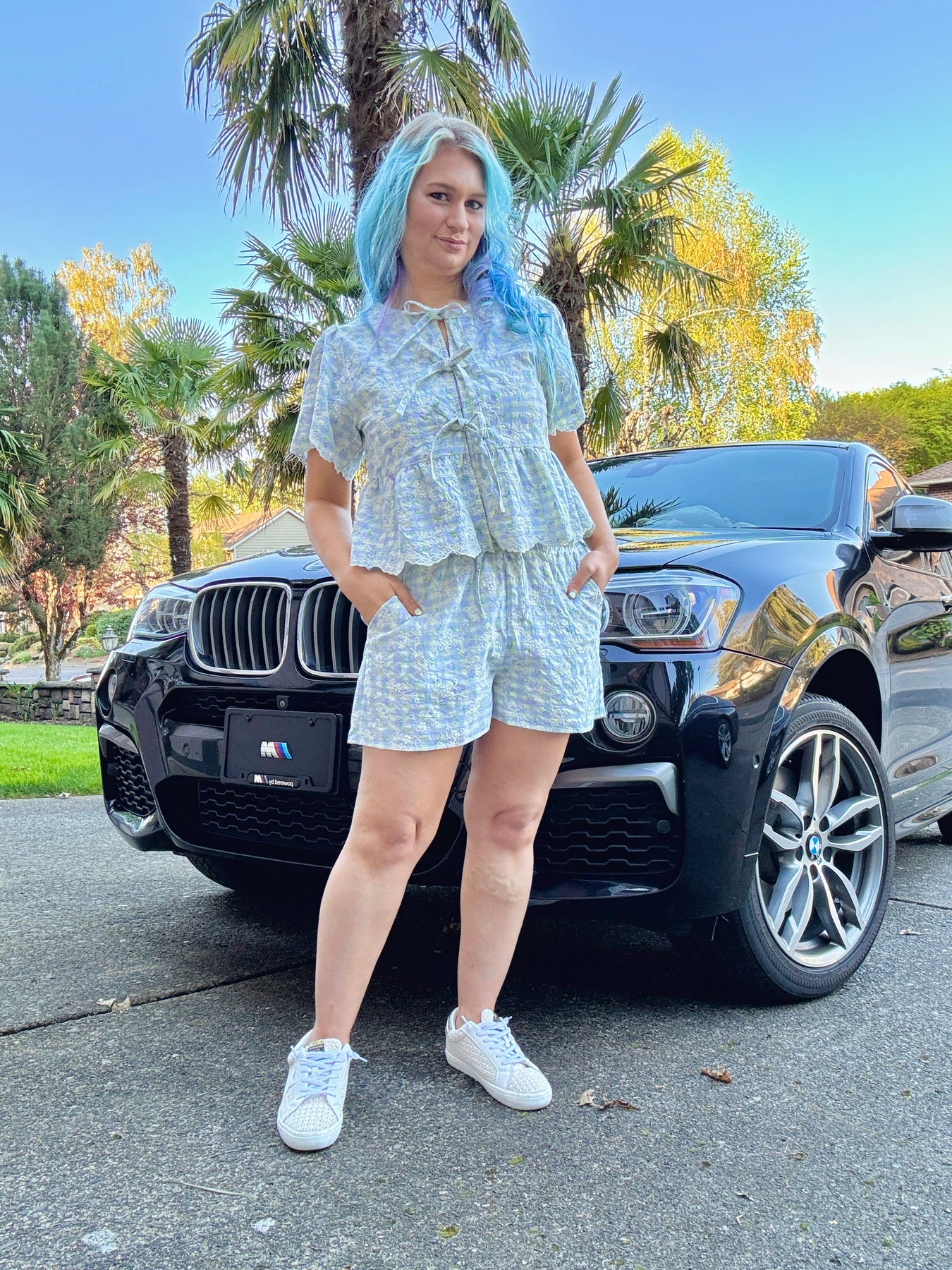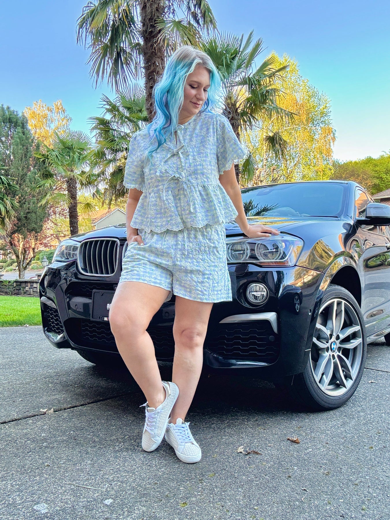 Embroidered floral gingham print short sleeve tie top with peplum hem, scalloped edges and lining on the inside.