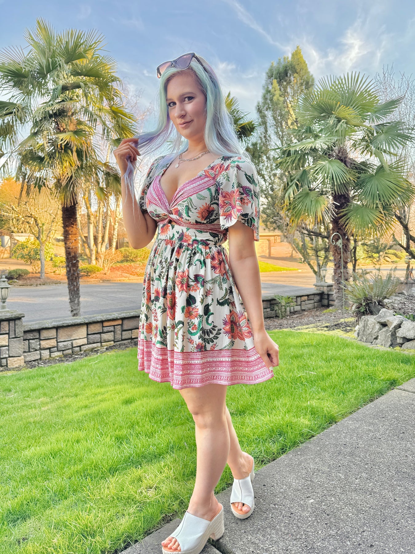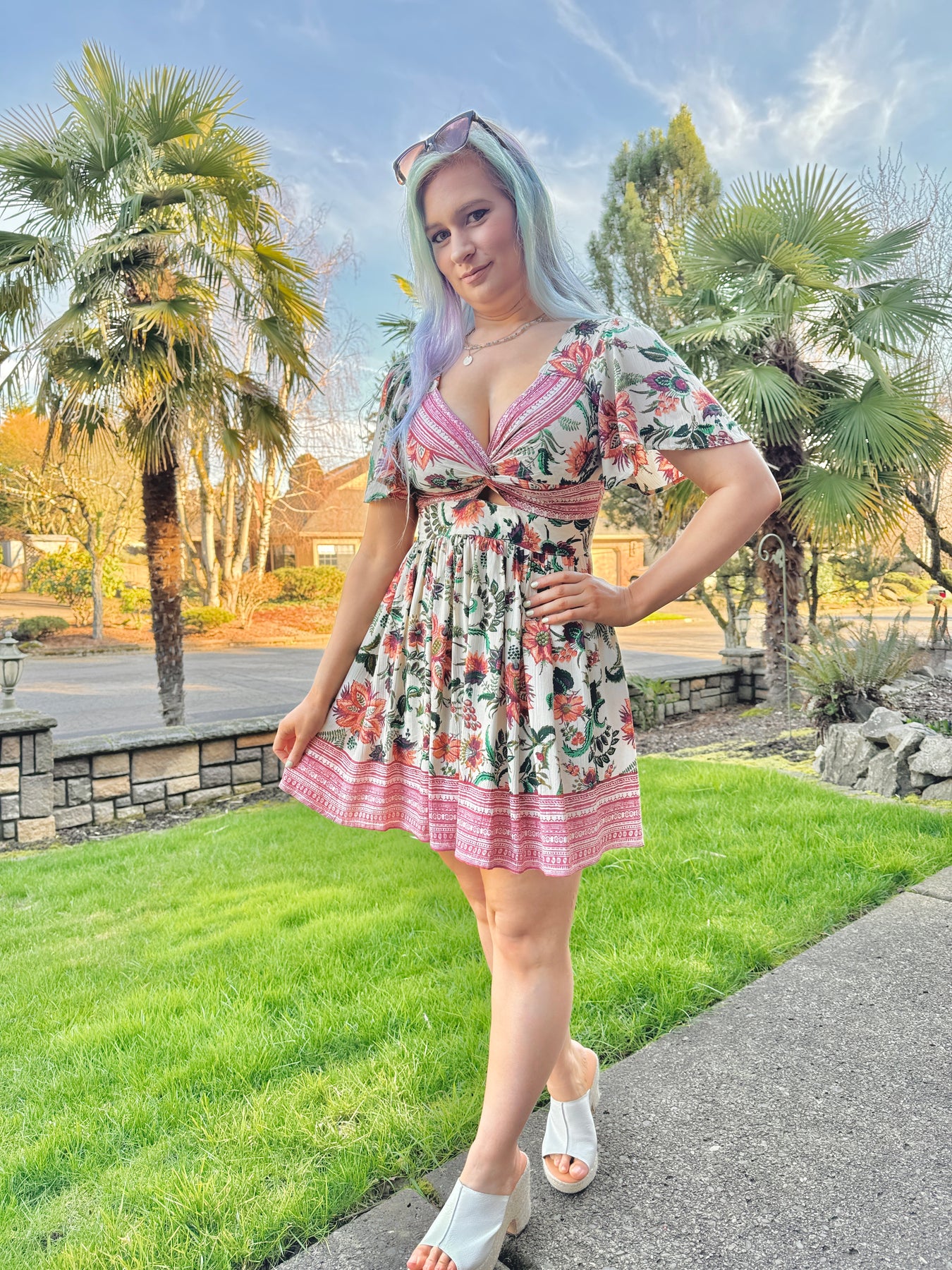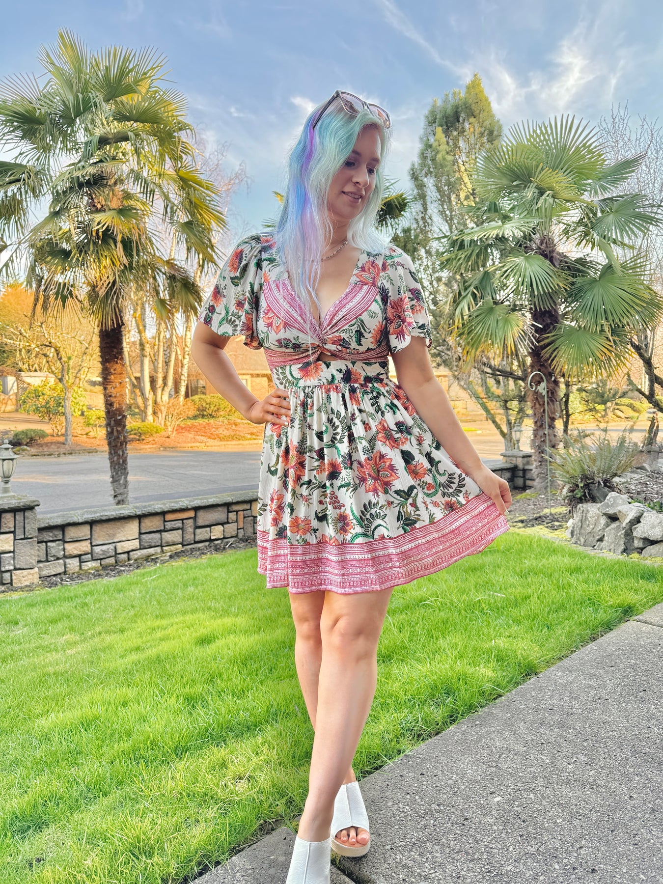 Twist front boho floral print short sleeve mini dress with a keyhole in the front and elastic in the back.