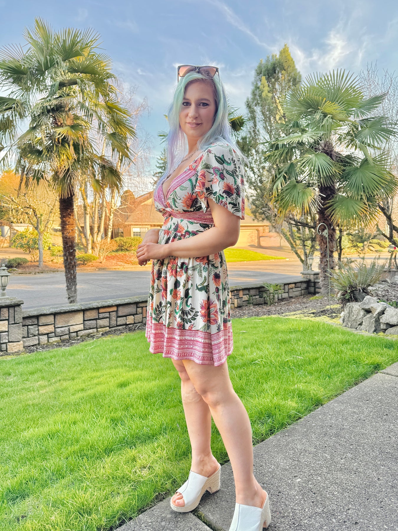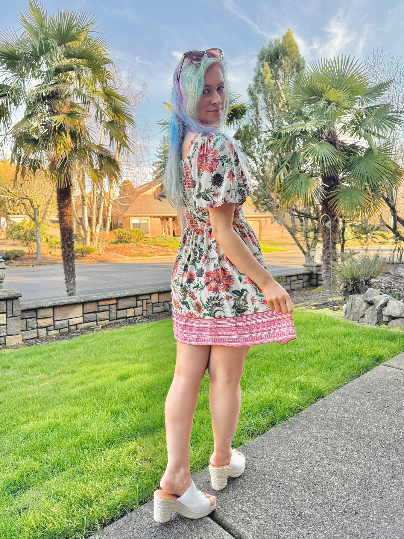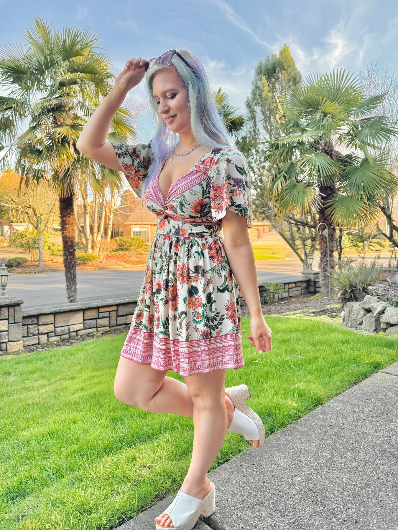 Twist front boho floral print short sleeve mini dress with a keyhole in the front and elastic in the back.