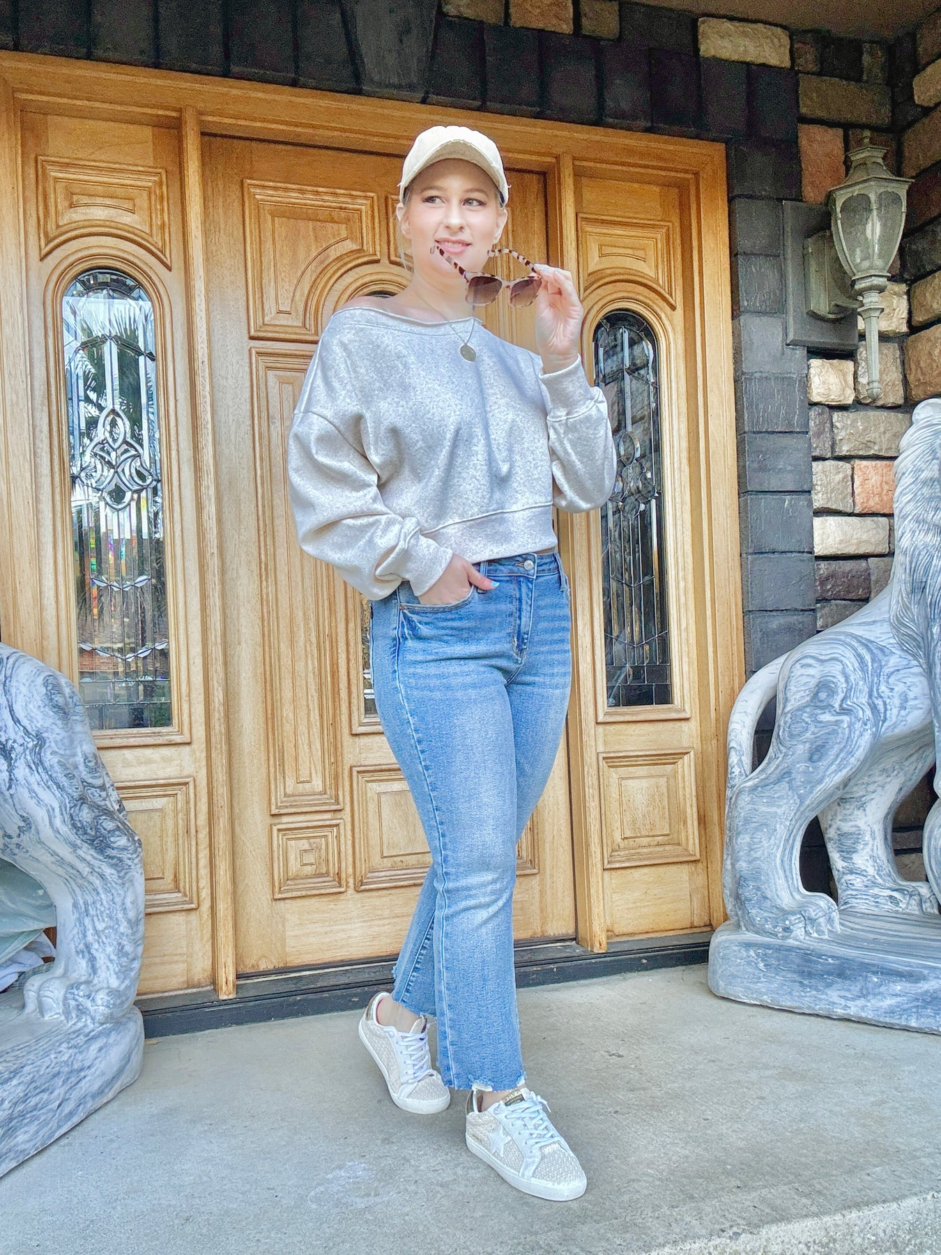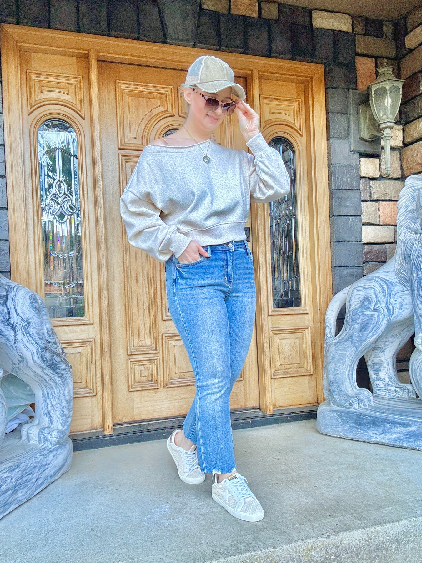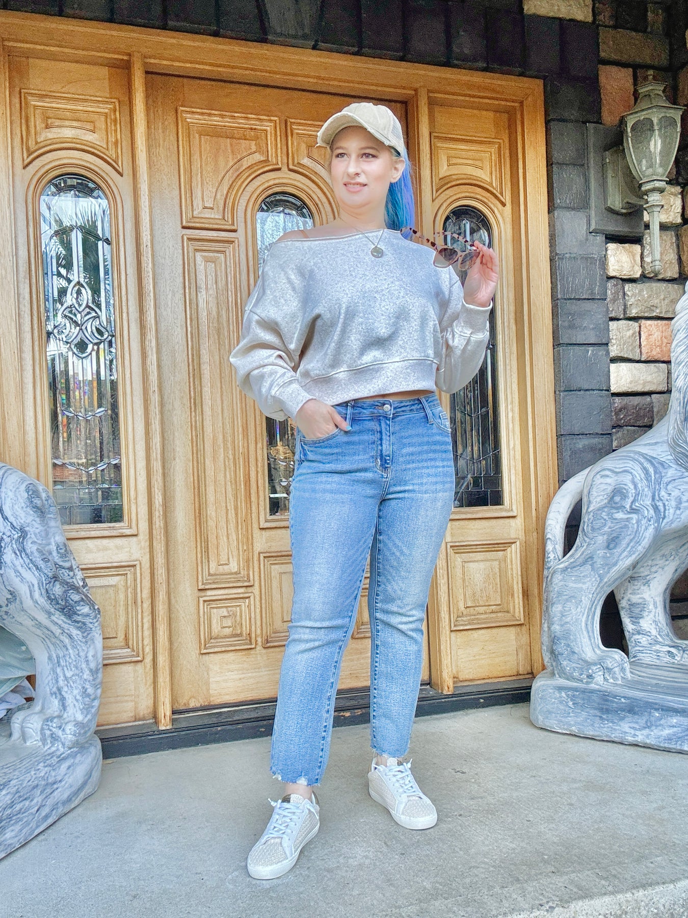 Cropped boat neck sweatshirt that can be worn off one shoulder. This sweatshirt is soft on the inside and it has a banded hem.