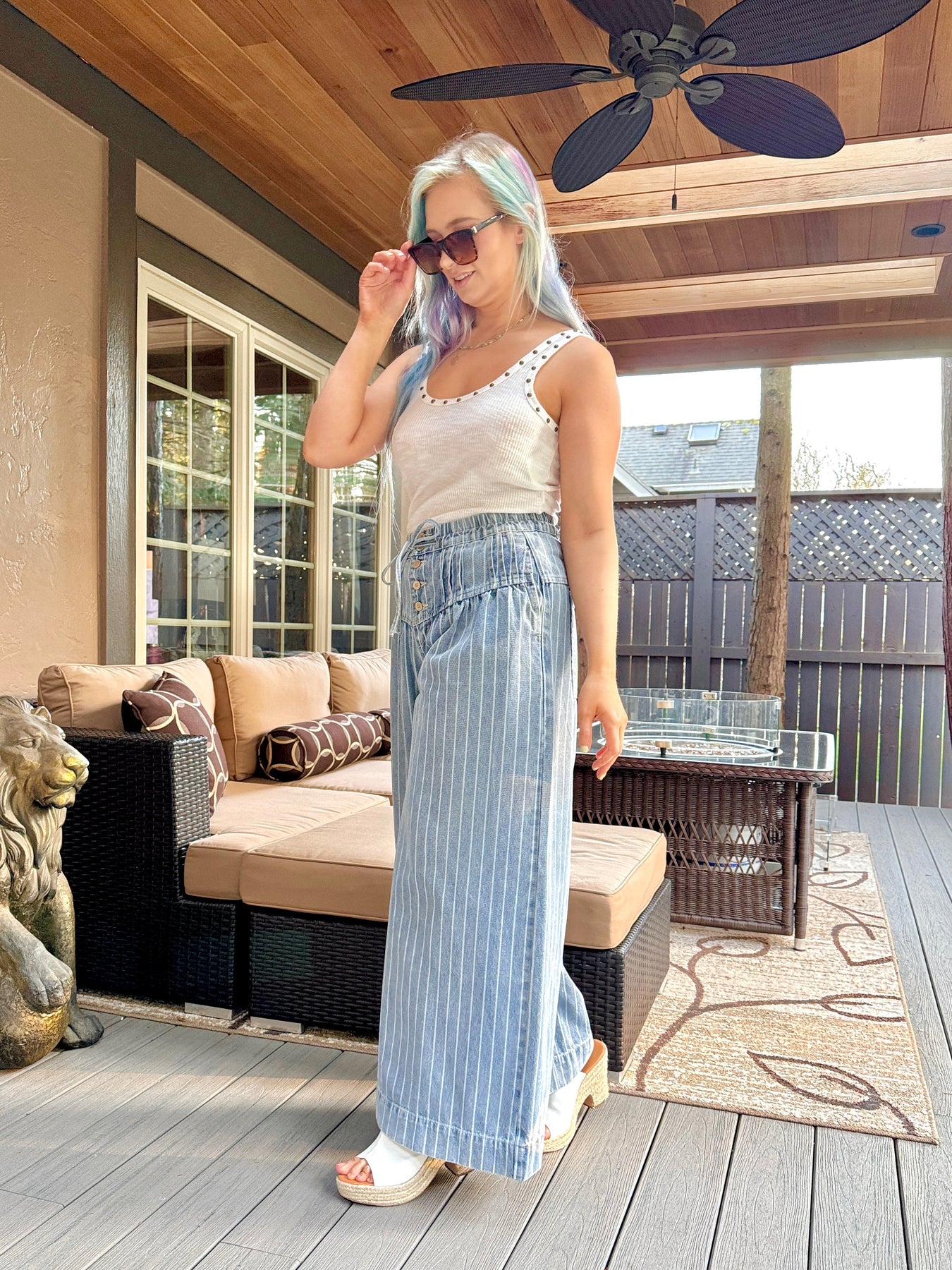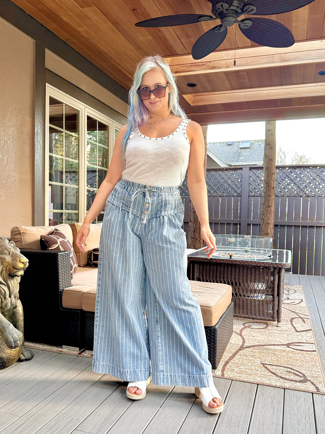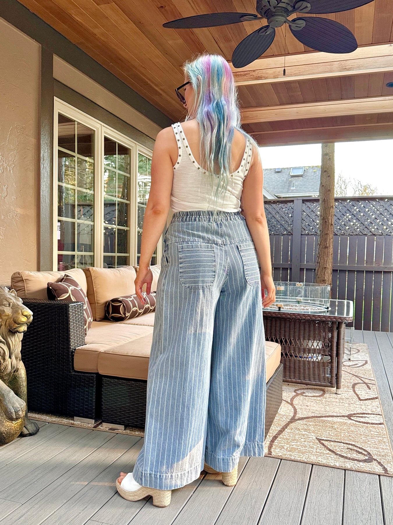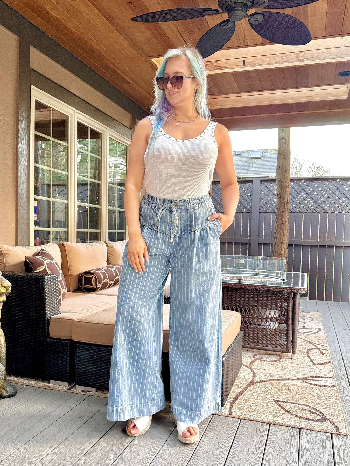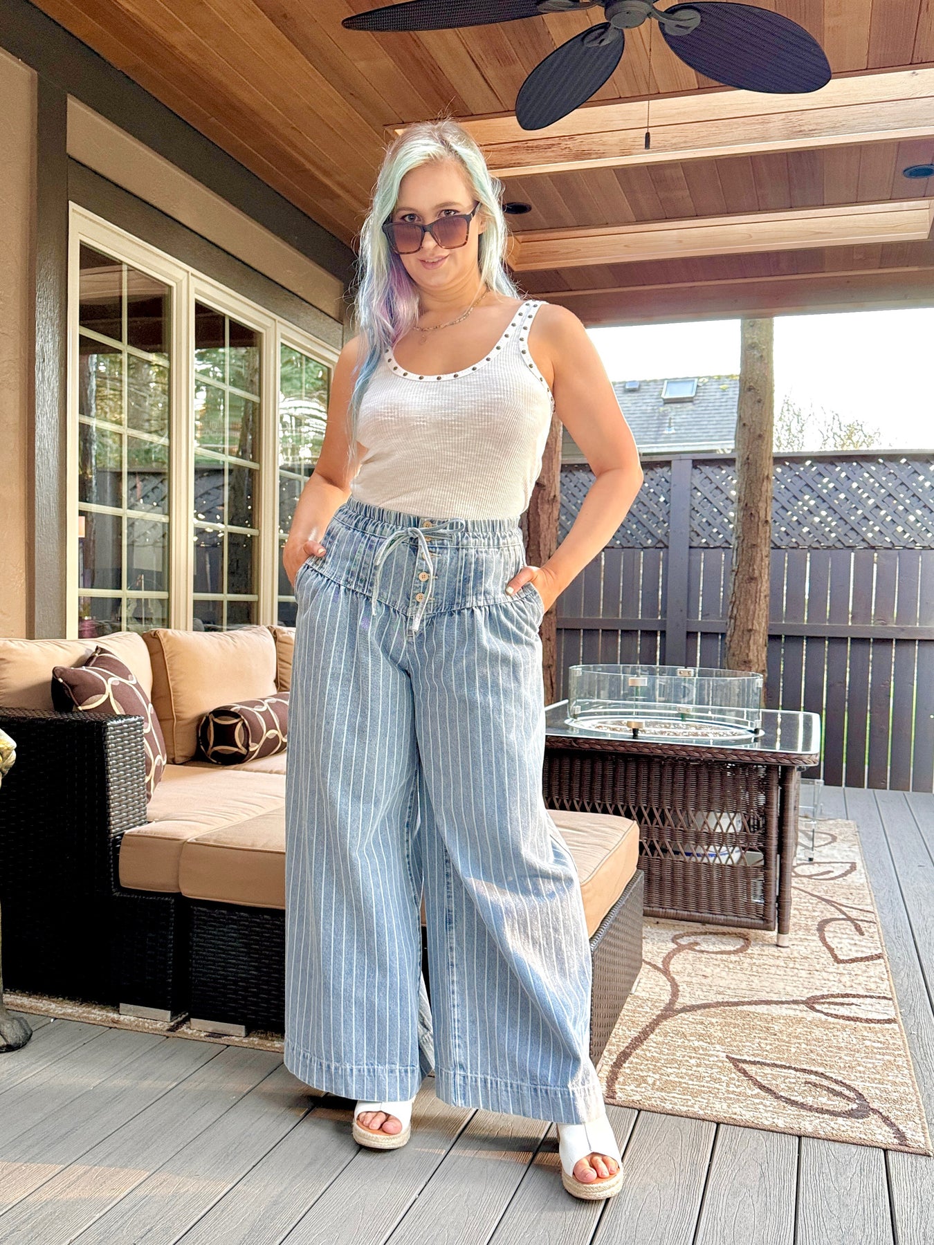 High waisted exposed button up striped wide leg denim pants with pockets, elastic waistband and functional drawstring.