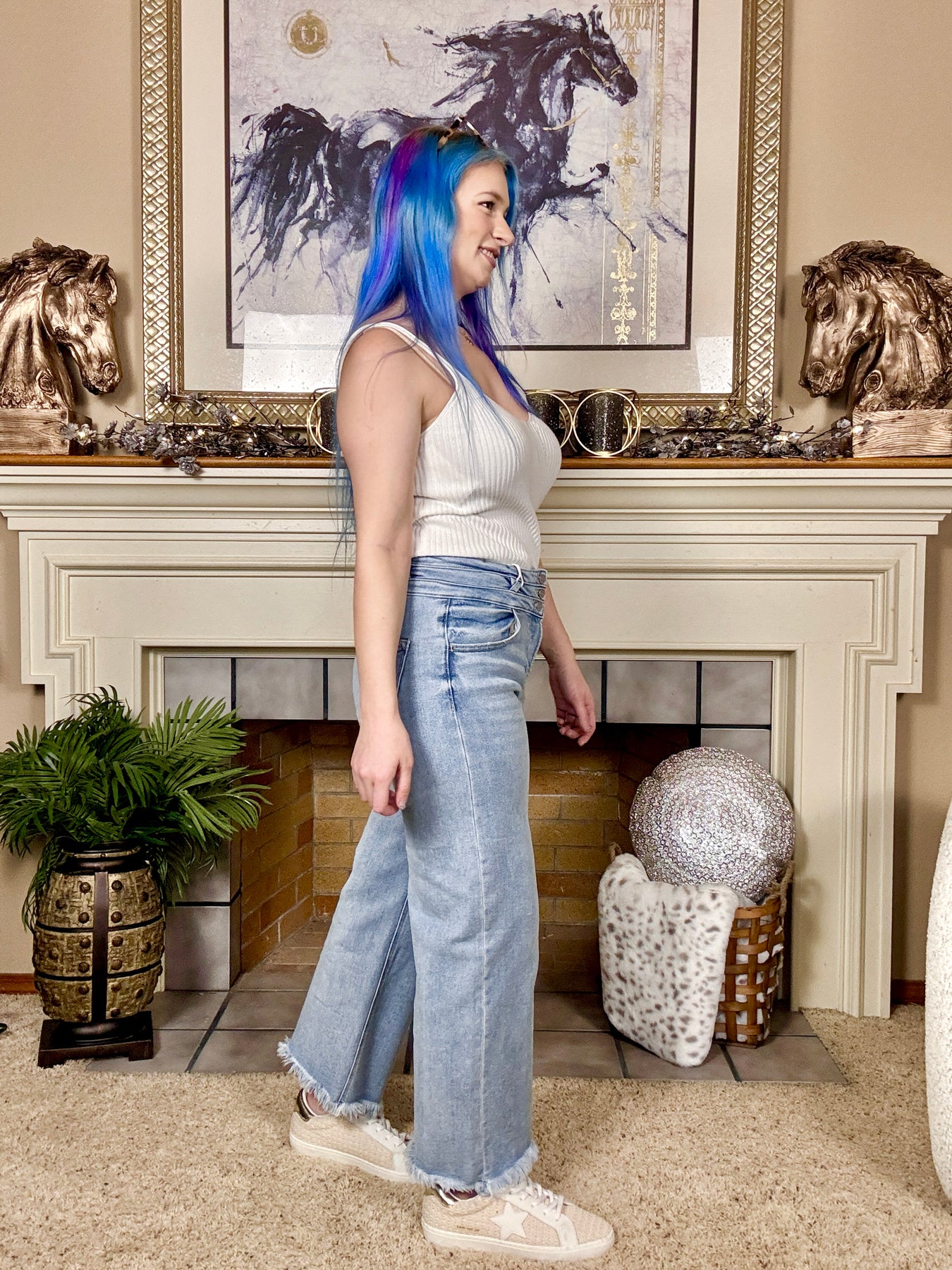 High rise cropped wide leg jeans with comfort stretch, grey hem and a 3 button and zipper closure.