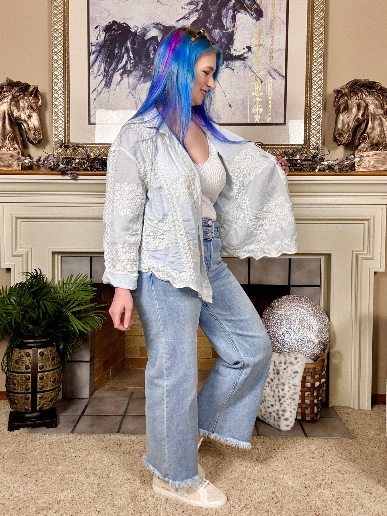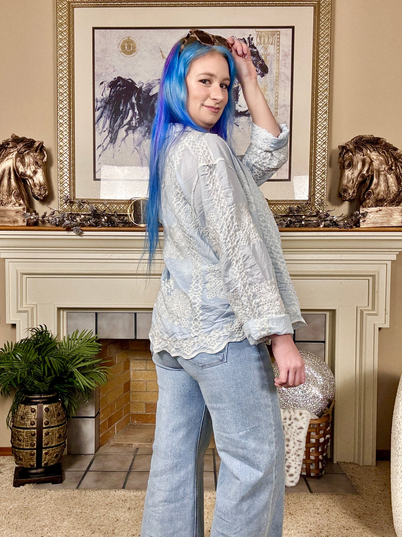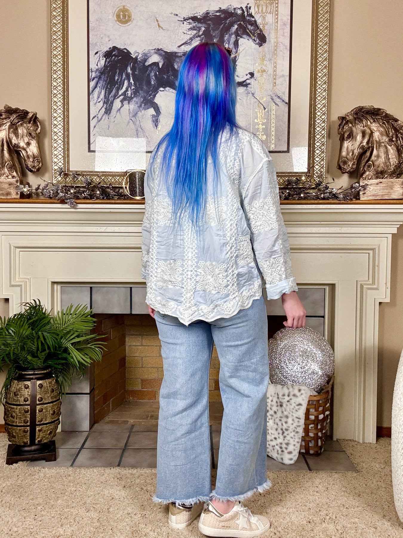 Curved hem long sleeve button up shirt with a relaxed fit, crinkle texture and varied embroidery pattern.