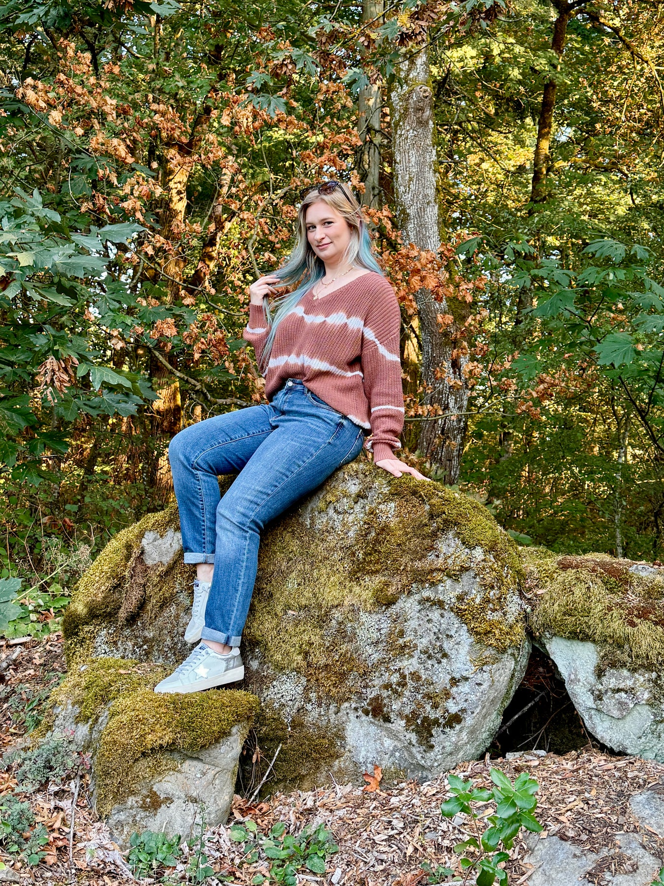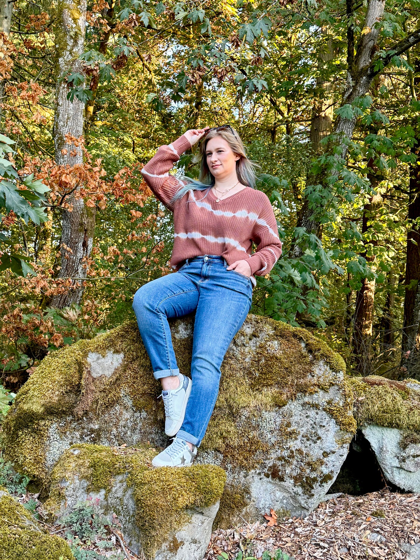 Medium weight tie dye striped knit sweater with ribbed hems and a v neckline.