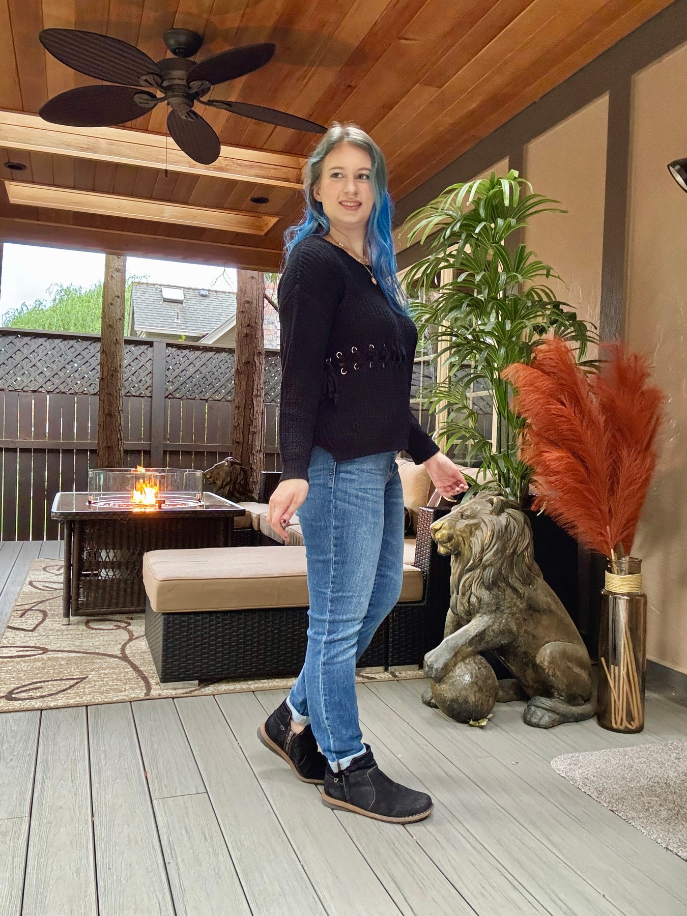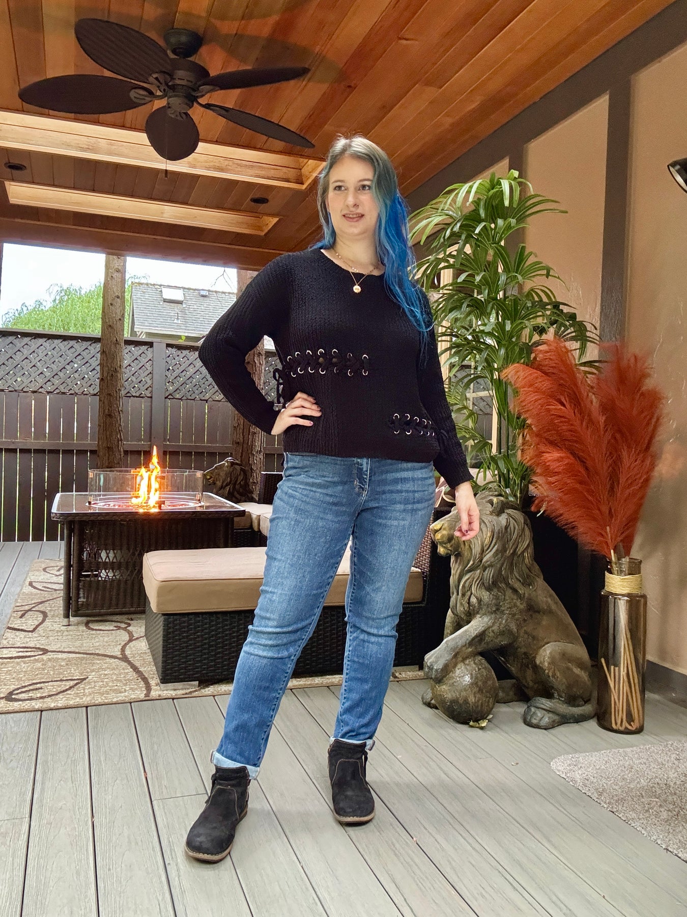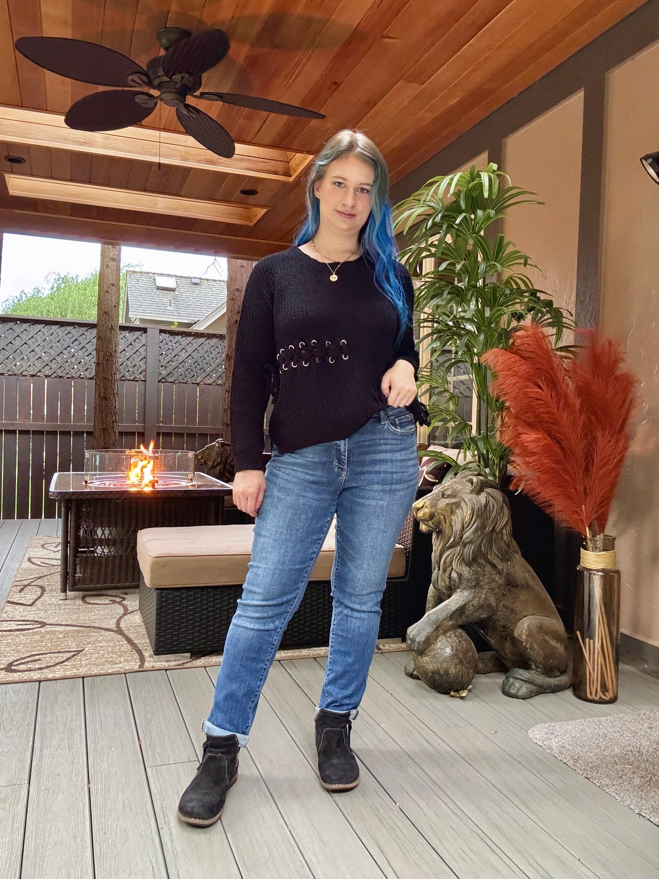 Super soft chenille like feel full length crewneck sweater with lace up grommet detail across front.
