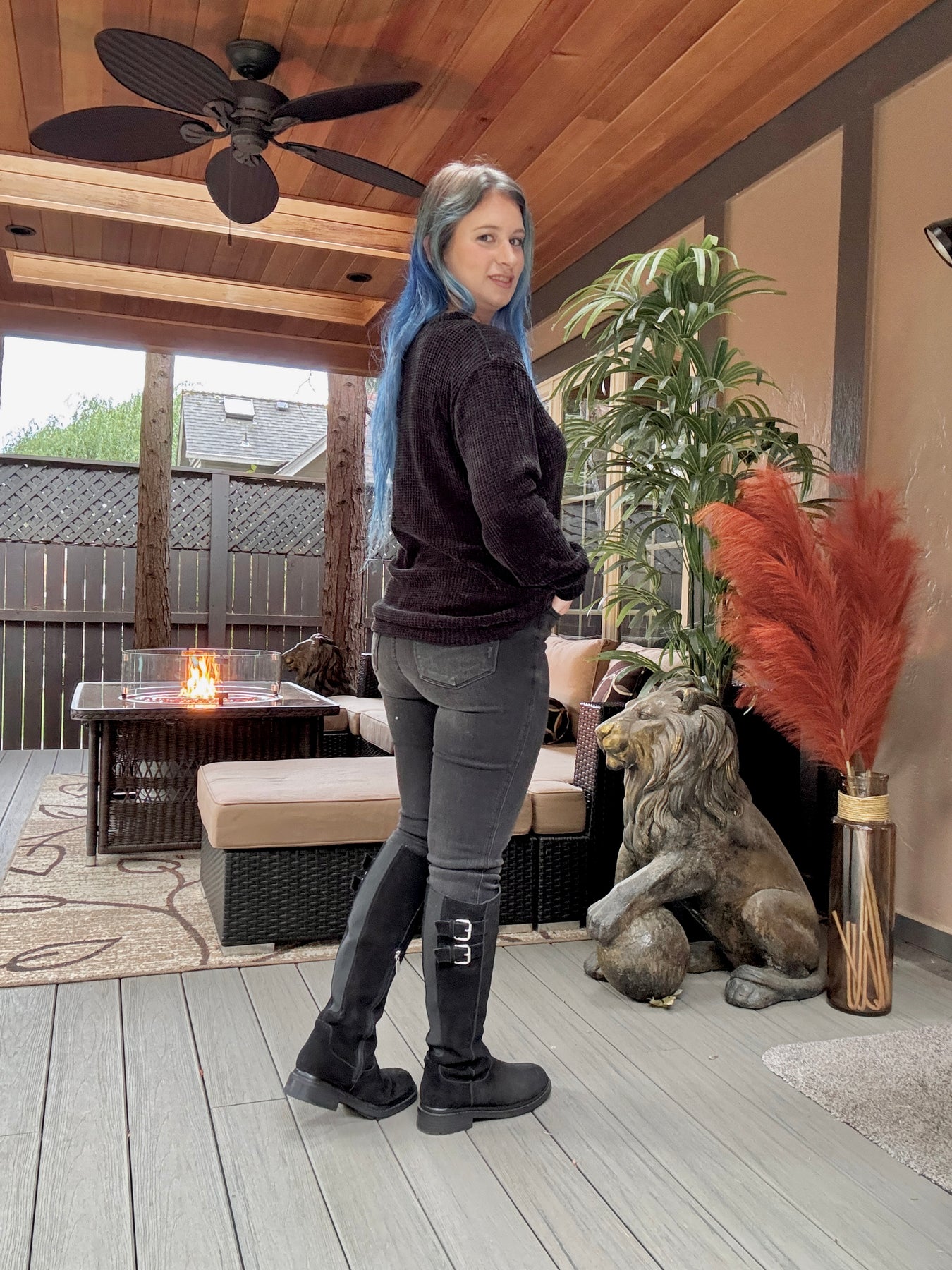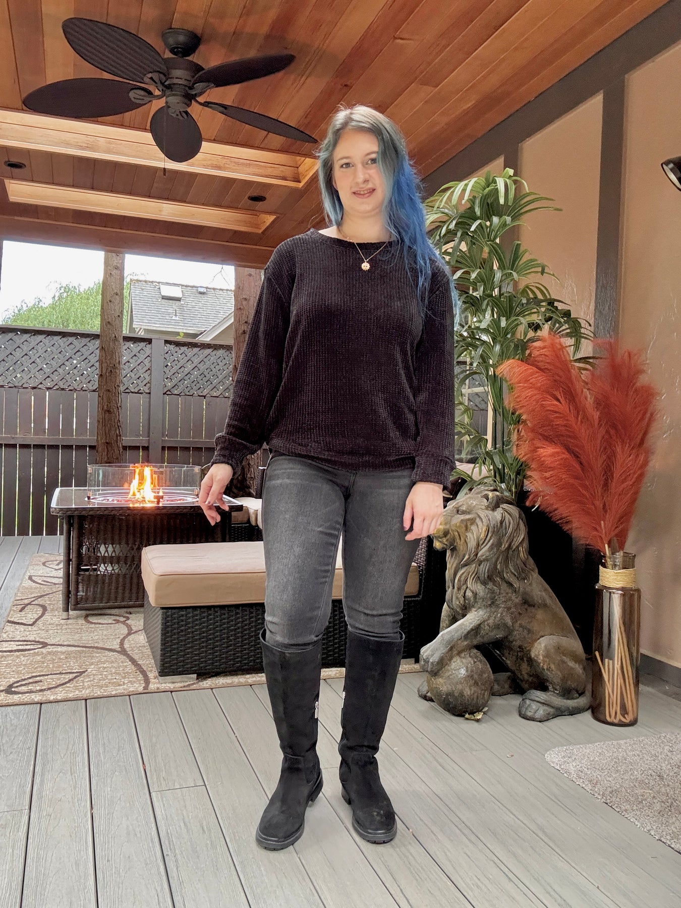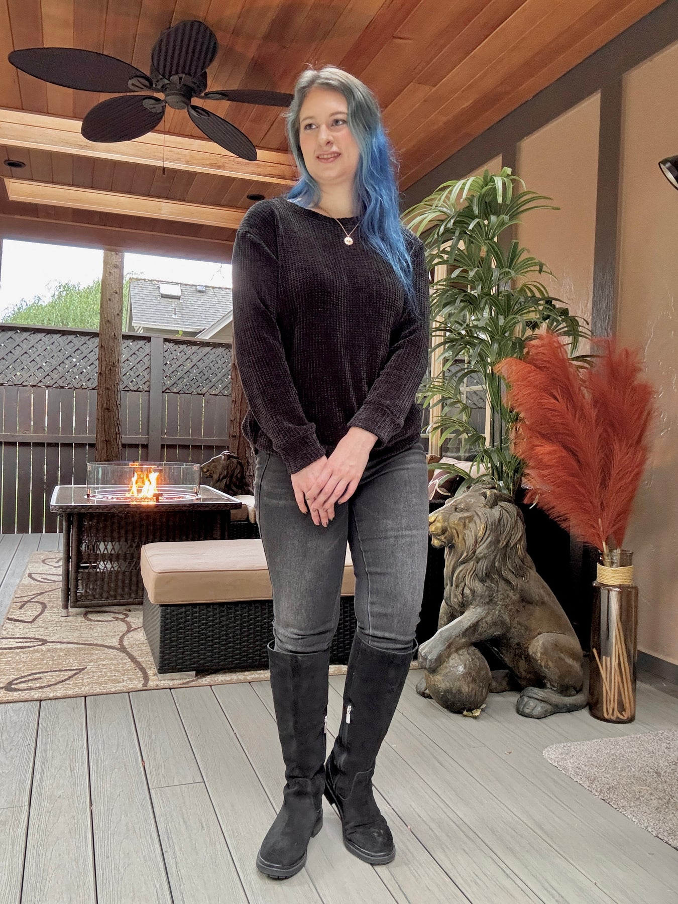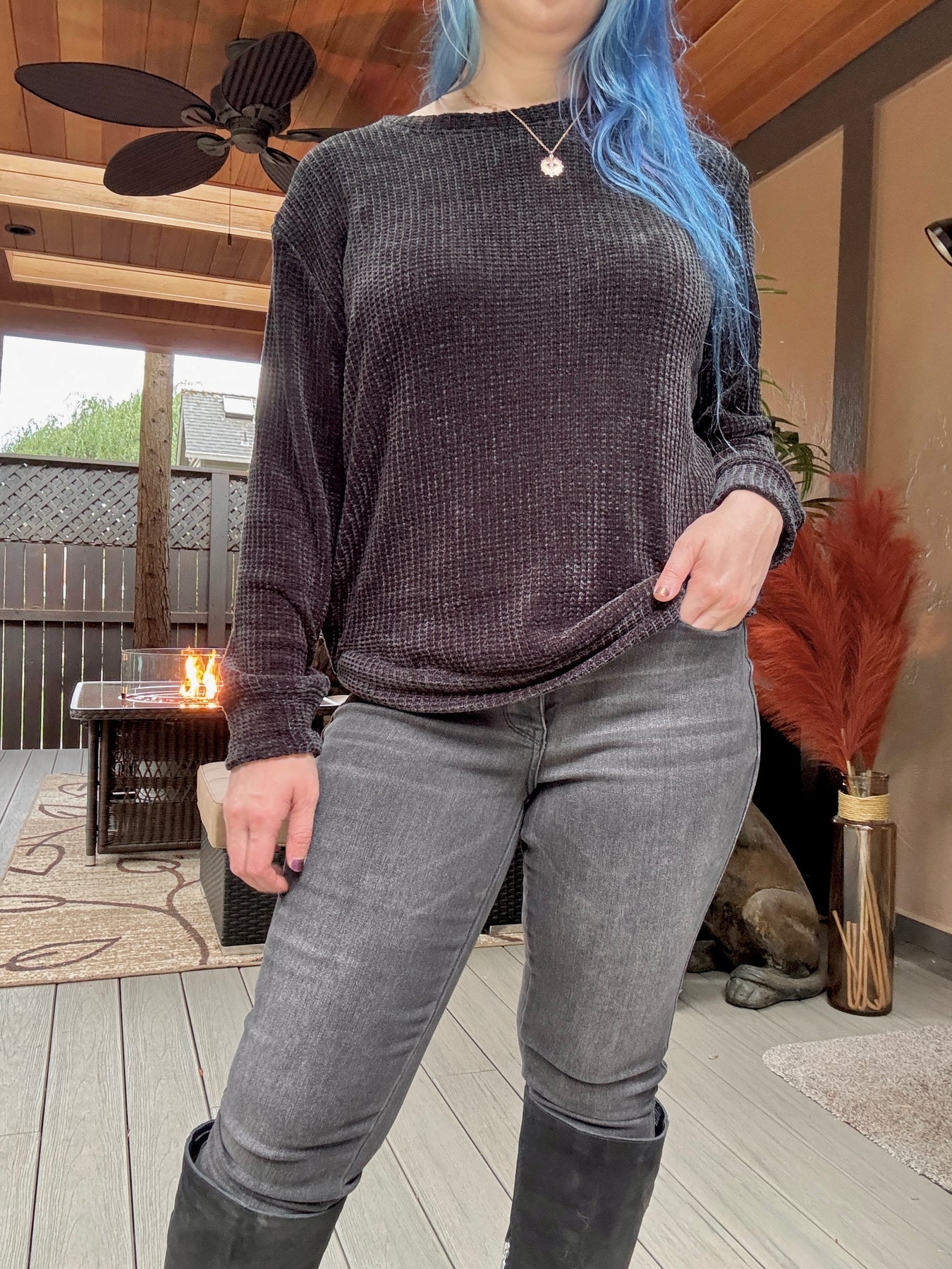 Super soft straight fit chenille waffle sweater with curved side hem. Full length sweater with crew neckline. An RTB Best Seller!!