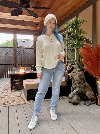 Full length lightweight curved hem waffle knit Henley long sleeve top with quarter button up front. Great top for layering!