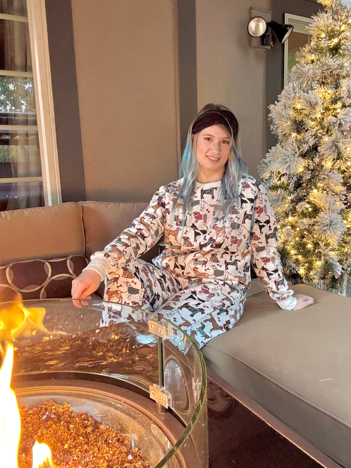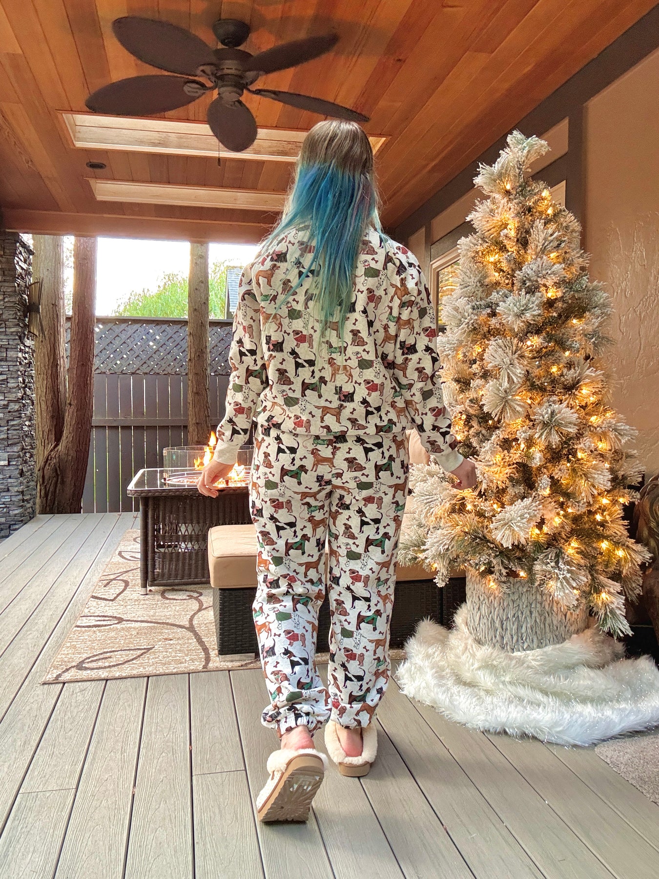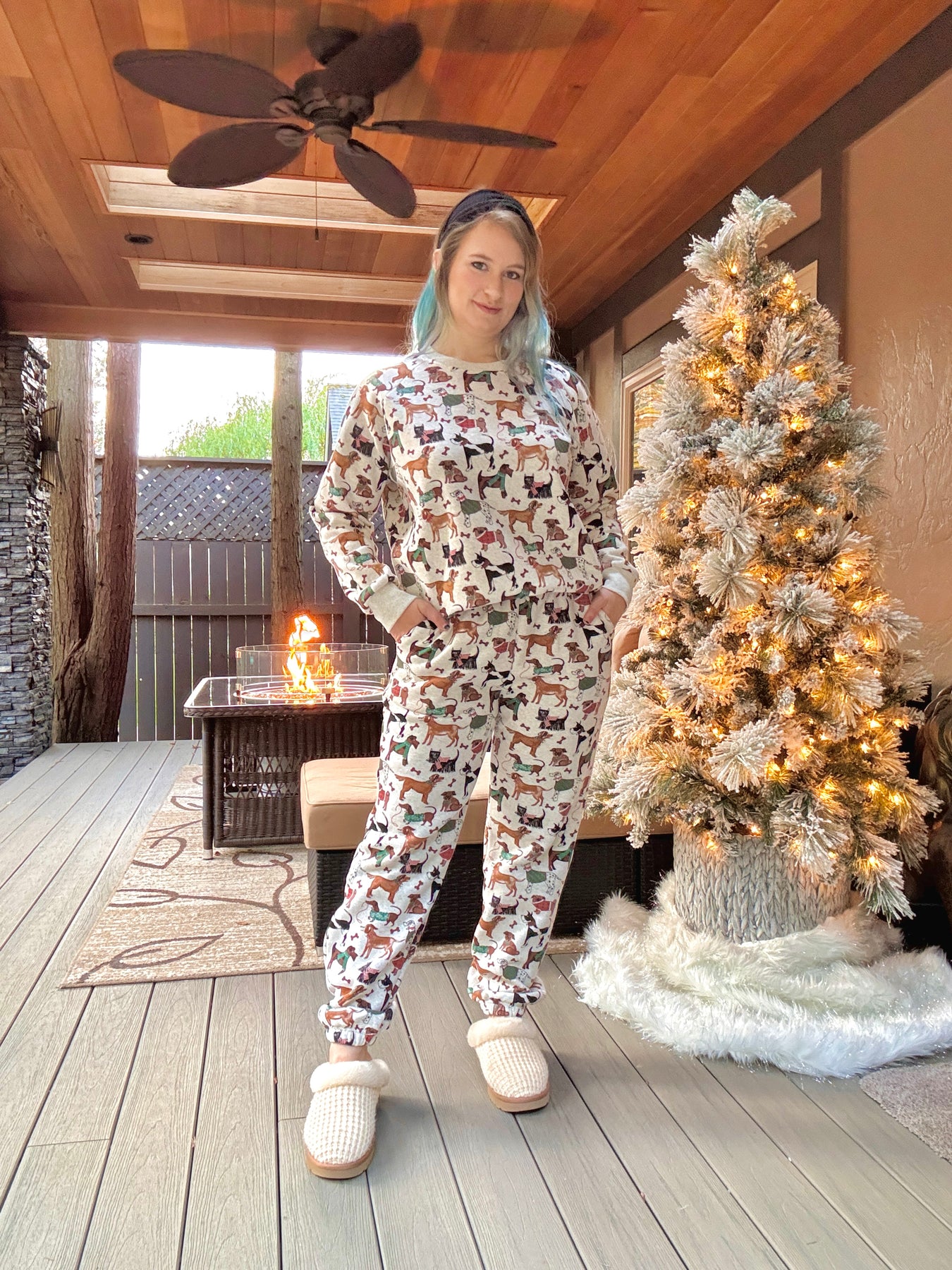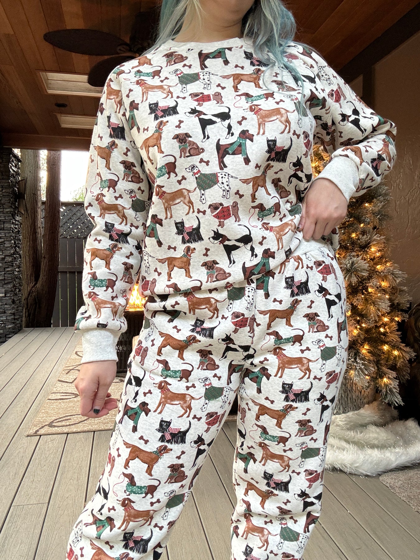 2 piece holiday dog print lounge set which includes a relaxed fit crewneck sweatshirt and jogger style sweatpants with an adjustable drawstring.