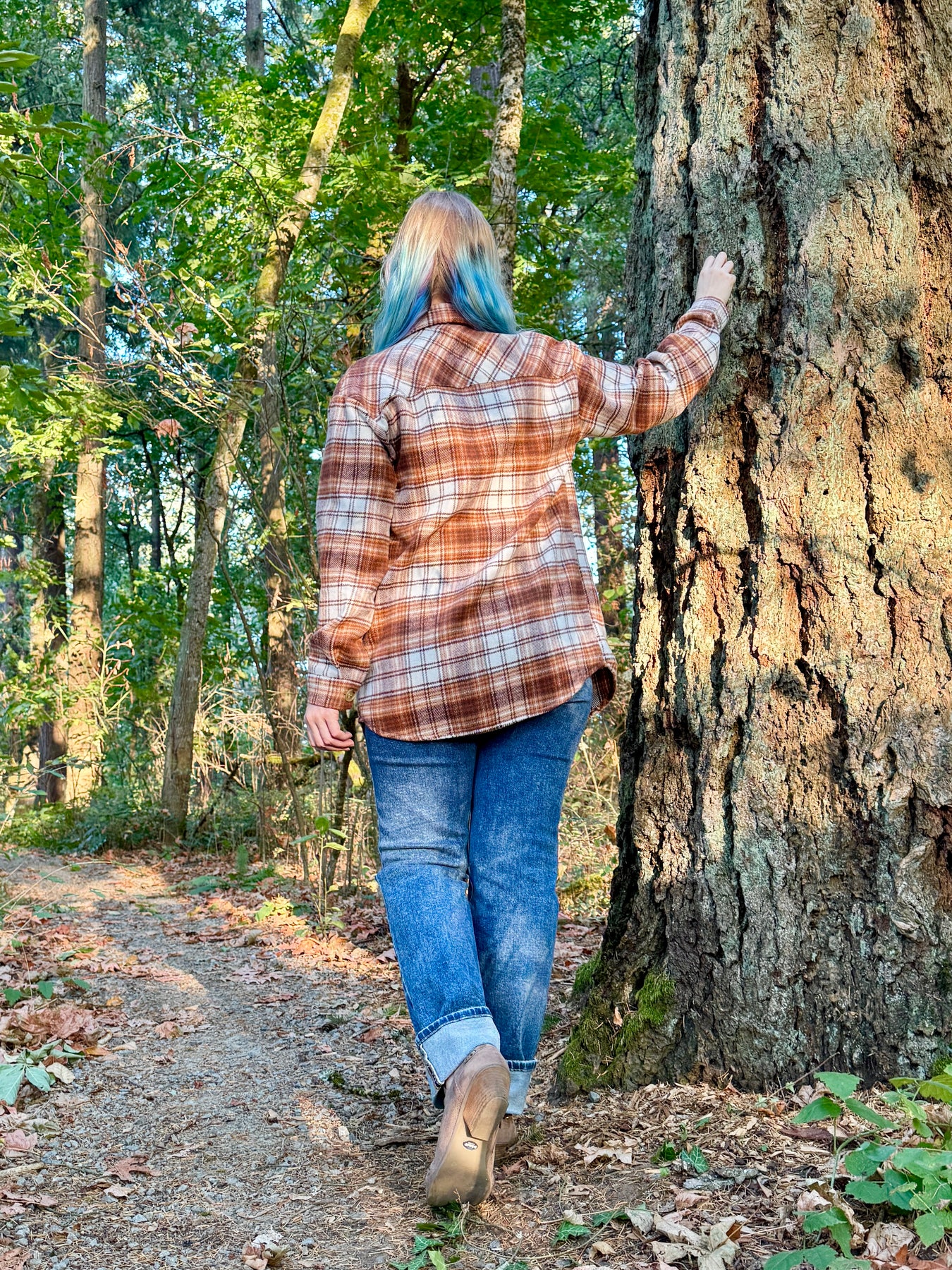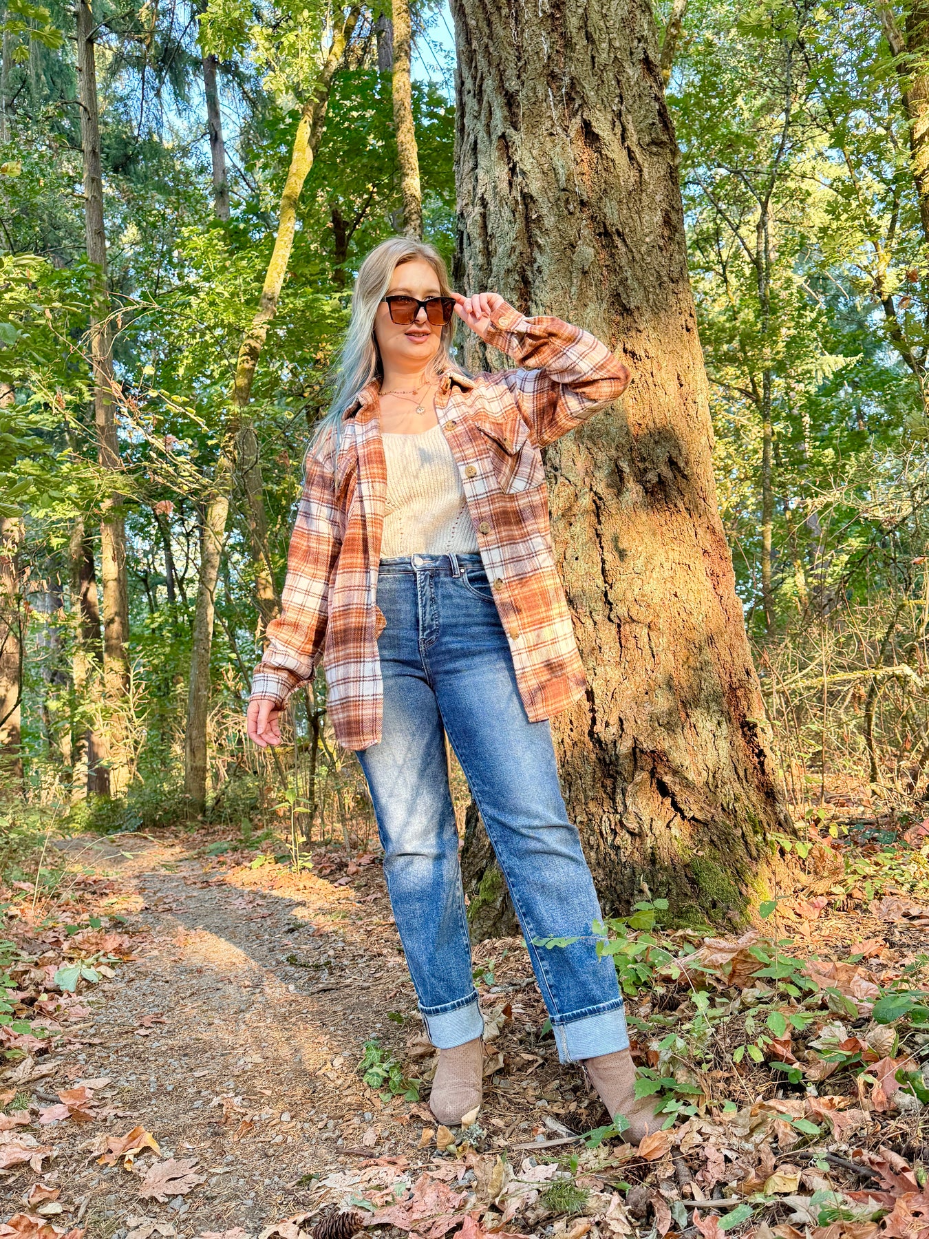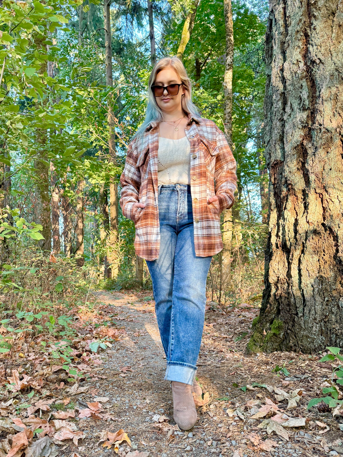 Long woven button up plaid shacket with a straight fit. This plaid shacket is a medium weight and also has side pockets and chest pockets.